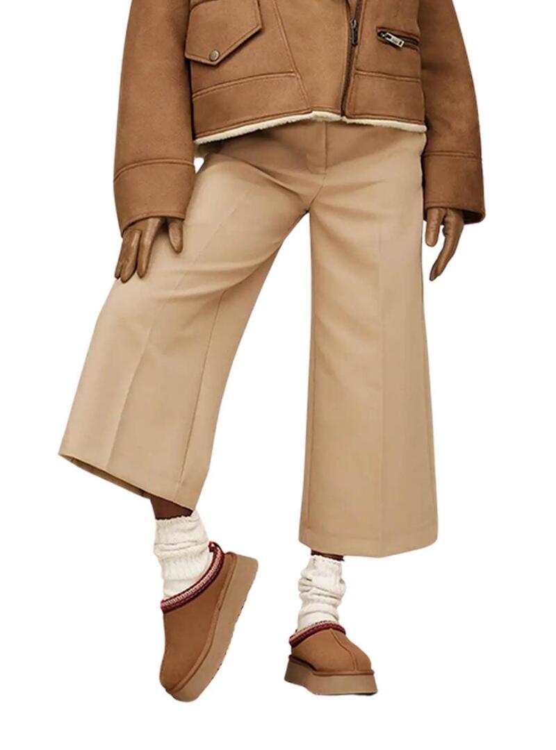 Zoccoli UGG. Modello Tazz II. Colore cammello. Senza tallone. Tomaia in morbida camoscio. Dettaglio intrecciato UGGbraid in poliestere 100% riciclato. Fodera e soletta in pelle di pecora da 10 mm per maggior calore e comfort. Suola leggera in EVA SugarSole di canna da zucchero a forma di dondolo. Piattaforma di 4,4 cm. Orlo in tessuto di poliestere 100% riciclato. Logo UGG termoimpresso.