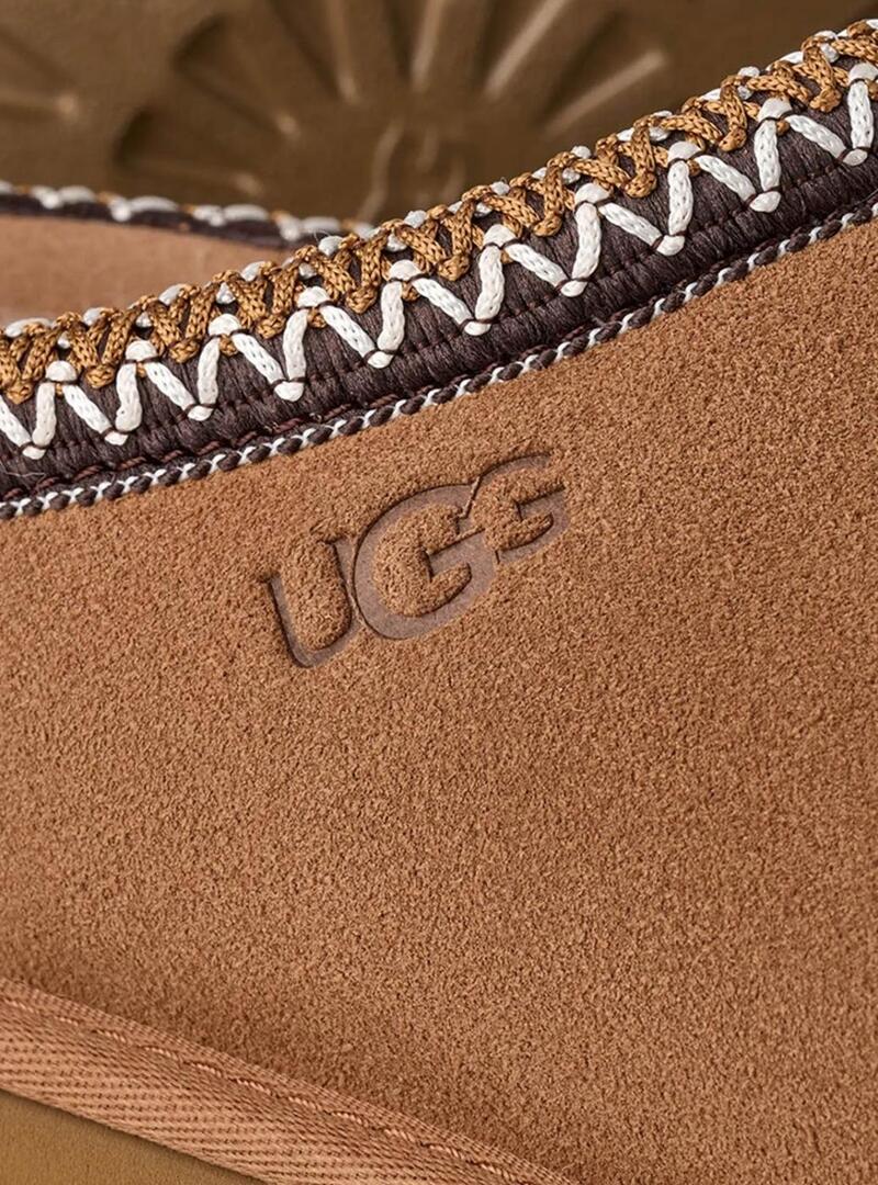 Ciabatte UGG. Modello Tasman II Chestnut. Colore marrone. Tomaia in camoscio. Dettaglio intrecciato UGGbraid realizzato con poliestere riciclato. Soletta in pelle di pecora di 17 mm. Suola in gomma EVA di canna da zucchero. Logo UGG termoimpresso. Etichetta con logo cucita sulla soletta.