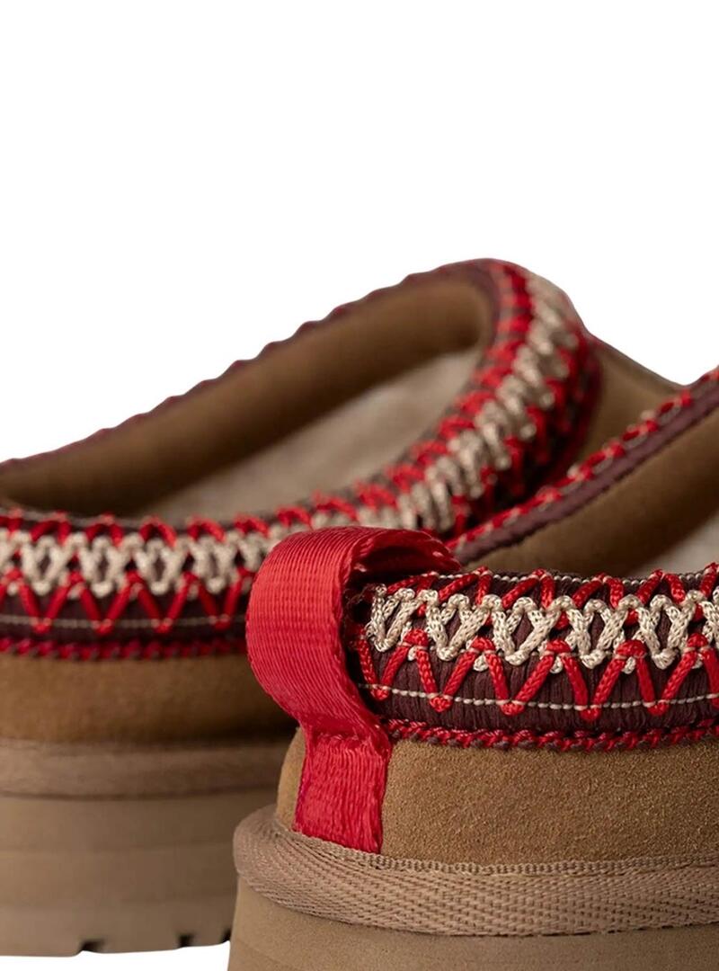 Zoccoli UGG. Modello Tazz. Colore cammello. Senza tallone. Parte superiore in camoscio trattato. Nastro etnico colore rosso. Logo Ugg in rilievo sulla parte superiore. Cuciture centrali saldate sulla parte superiore. Fodera misto lana UGGplush per maggiore morbidezza e comfort. Suola piattaforma SugarSole da 1,5 cm. Sistema di misurazione europeo.