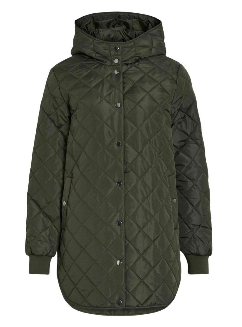 Cappotto trapuntato di Vila. Modello Vitate. Colore verde. Con cappuccio. Chiusura a bottoni a pressione. Taglio regolare. Tasche frontali con bottone. Motivo a rombi. Leggermente più lungo nella parte posteriore.