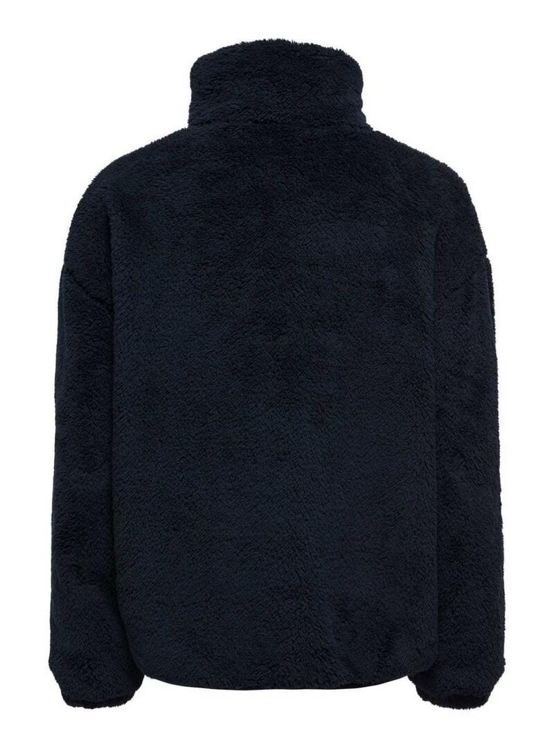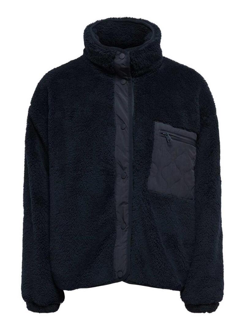 Giacca Only. Modello Cantact. Stile sherpa. Colore blu scuro. Colletto alto. Chiusura con bottoni. Tasca a toppa sul petto con zip. Tessuto morbido. Tasche laterali. Dettagli in tessuto liscio.