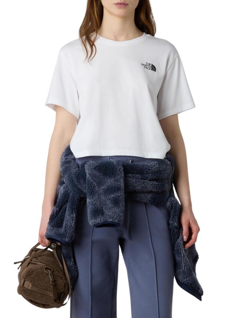 Maglietta The North Face. Modello Simple Dome. Colore bianco. Collo rotondo. Manica corta. Vestibilità ampia. Logo stampato sul petto e sulla schiena. Taglio cropped.
