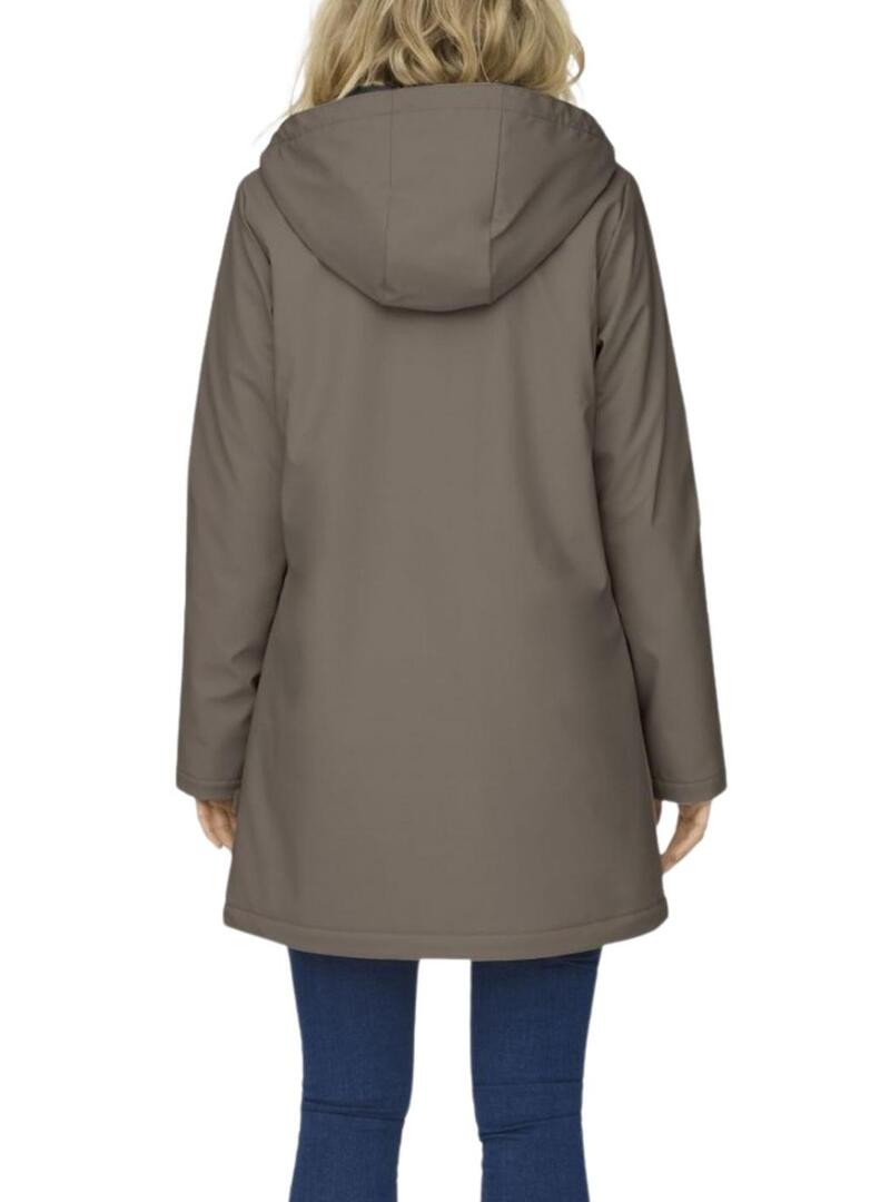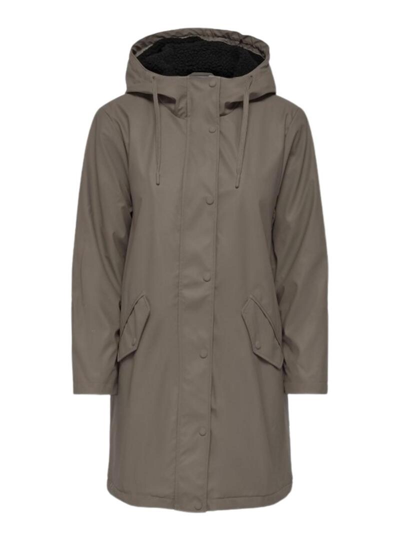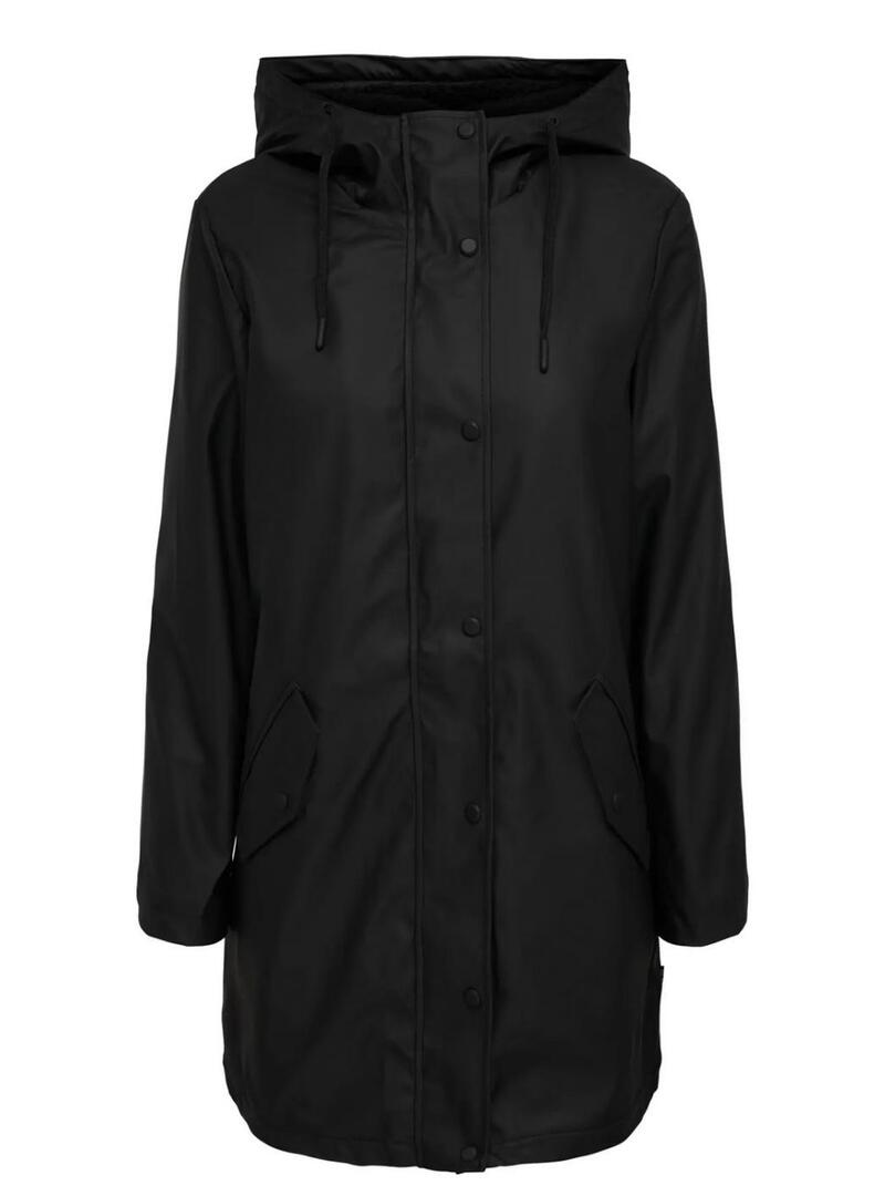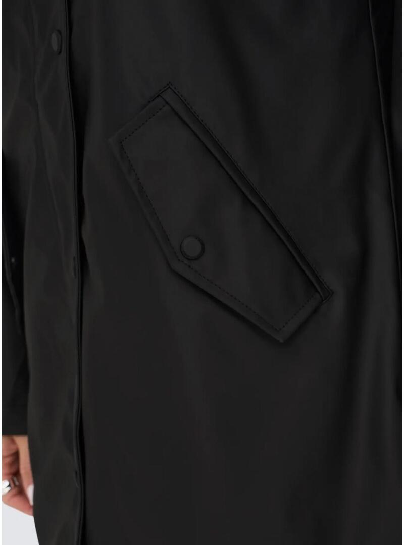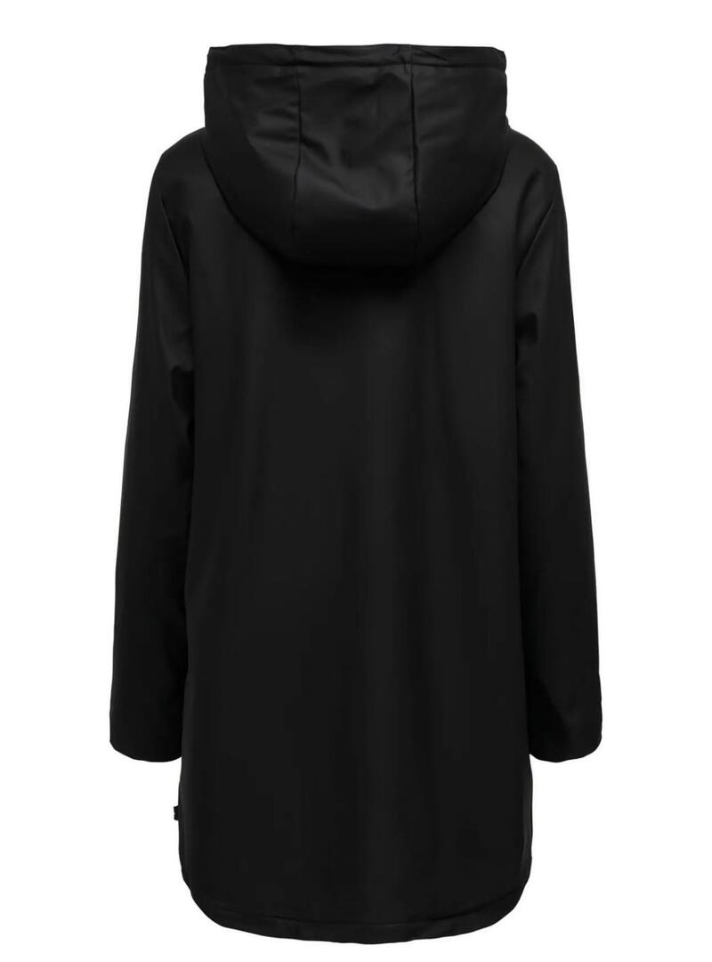 Impermeabile Only. Colore nero. Cappuccio regolabile con cordini. Tessuto impermeabile. Chiusura con zip e bottoni. Tasche anteriori con patta e bottoni. Taglio regular. Foderato con pelliccia sintetica. La modella indossa la taglia S.