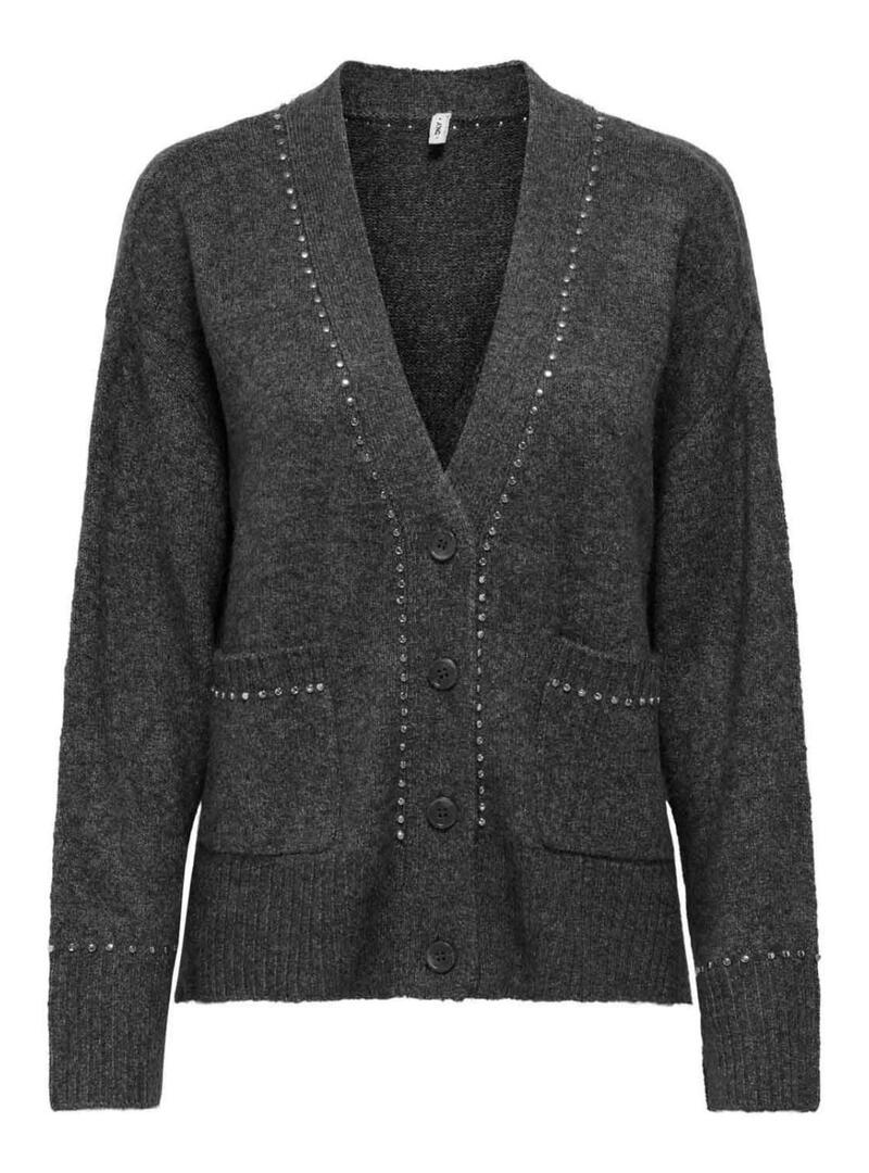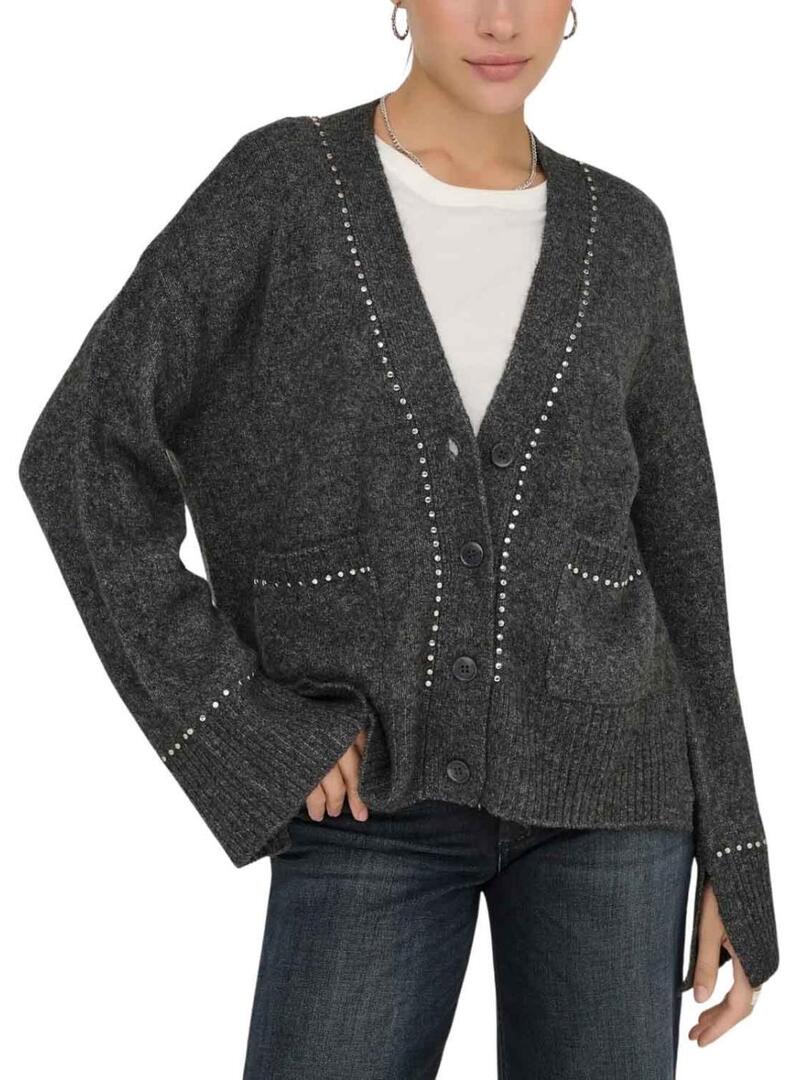 Giacca Only. Modello Elsie. Colore grigio. Scollo a V. Chiusura con bottoni. Vestibilità oversize. Orli a costine. Tasche laterali applicate. Dettagli con borchie.