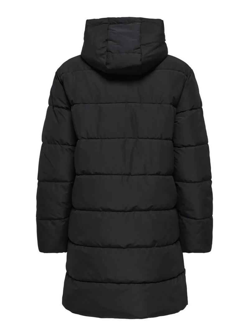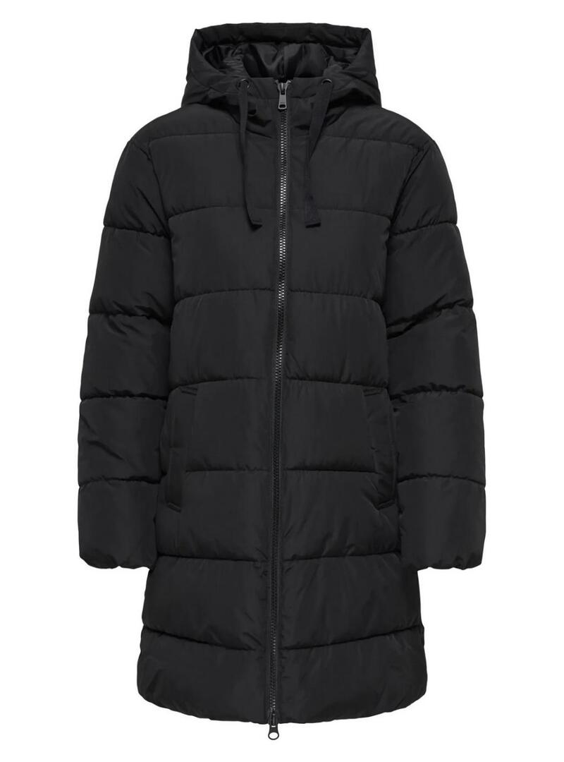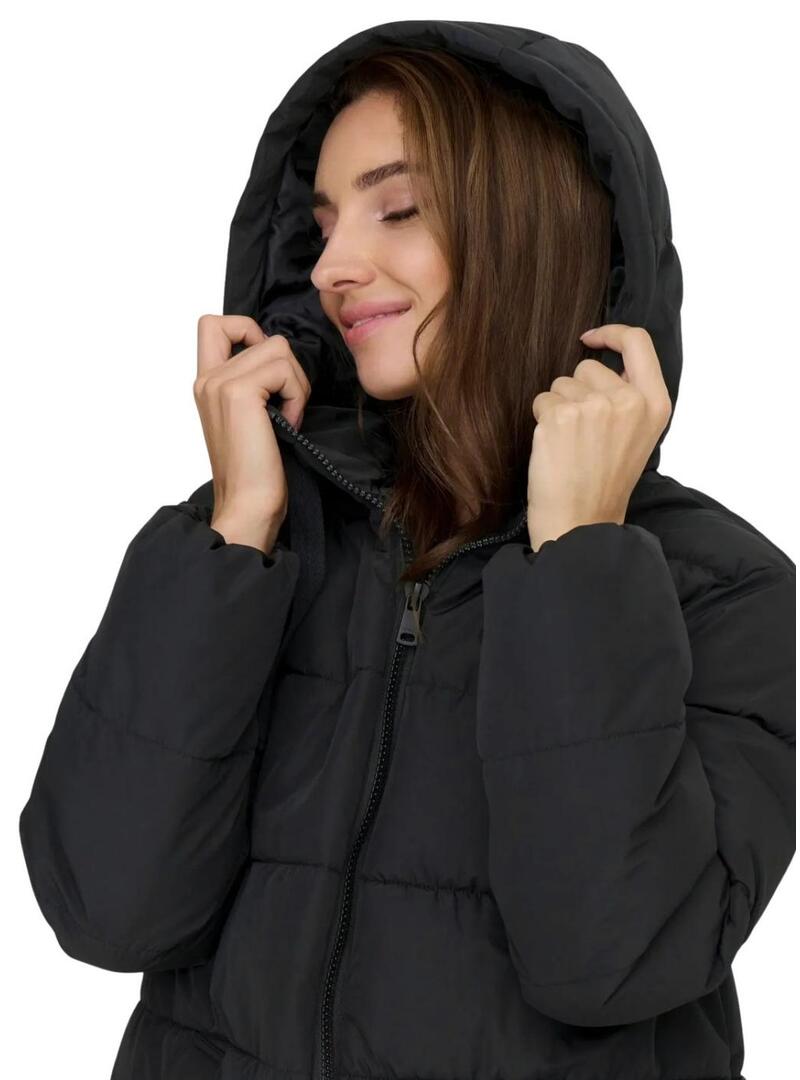 Cappotto imbottito Only. Modello Clair. Colore nero. Cappuccio con cordino largo regolabile. Chiusura con zip bidirezionale. Lunghezza sopra il ginocchio. Tasche laterali. Imbottitura leggera con volume. Vestibilità regolare. Stile basic.
