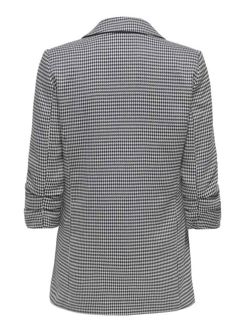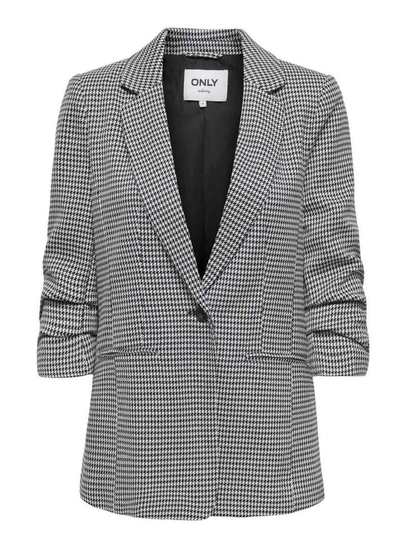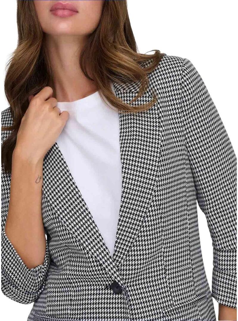Blazer Only. Modello Lettie. Colore nero e bianco. Stampato a piedi di gallina. Chiusura con un bottone. Tasche laterali a filetto. Manica 3/4 arricciata. Vestibilità regolare.