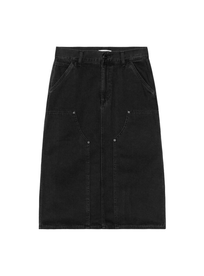 Gonna Carhartt. Modello Double Knee. Colore nero. Tessuto denim. Chiusura con bottone e zip. Lunghezza sotto il ginocchio. Patch del marchio sulla tasca posteriore. Cuciture decorative in stile carpenter.