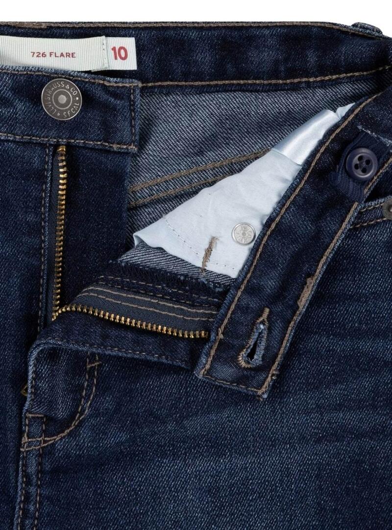 Jeans Levis. Modello 726. Denim scuro. Chiusura con bottone e cerniera. Taglio a zampa di elefante. Cinque tasche. Tessuto elasticizzato. Effetto lavato.