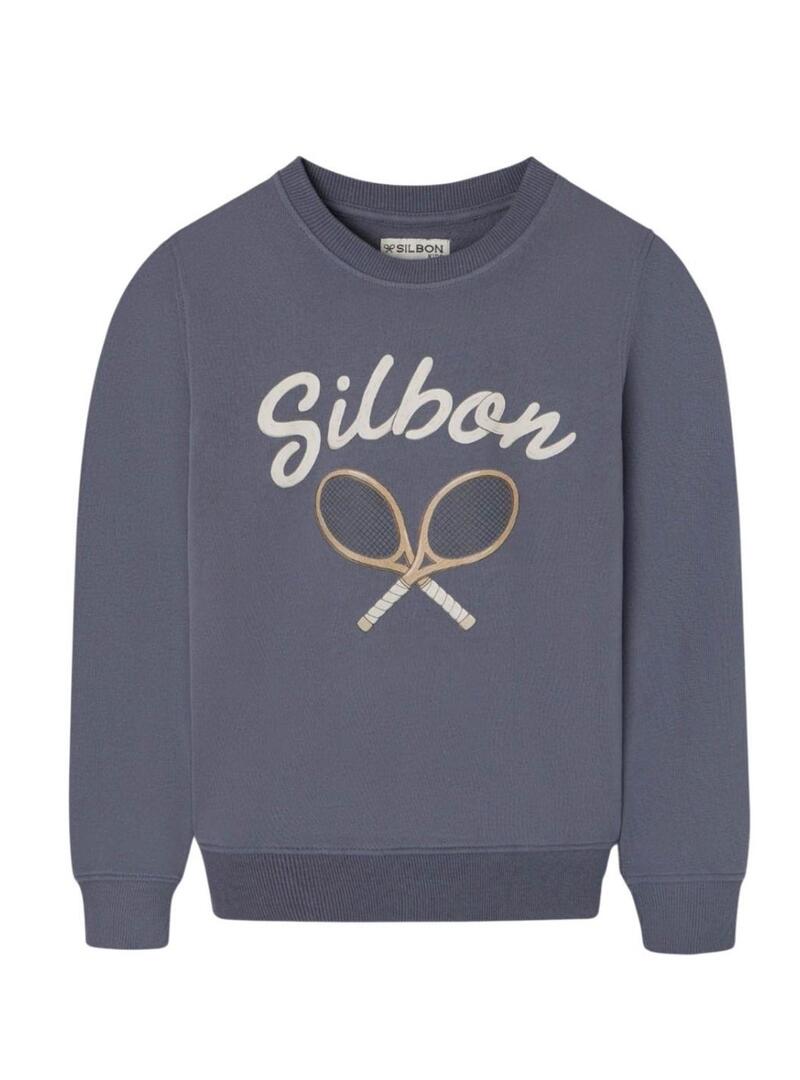 Maglione Silbon. Modello Raqueta. Colore blu. Effetto lavato. Collo rotondo. Orli a costine. Vestibilità regolare. Illustrazione vintage con logo sul petto.