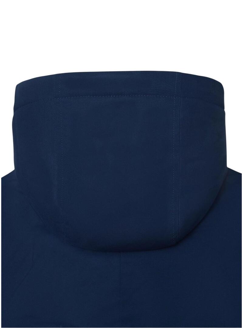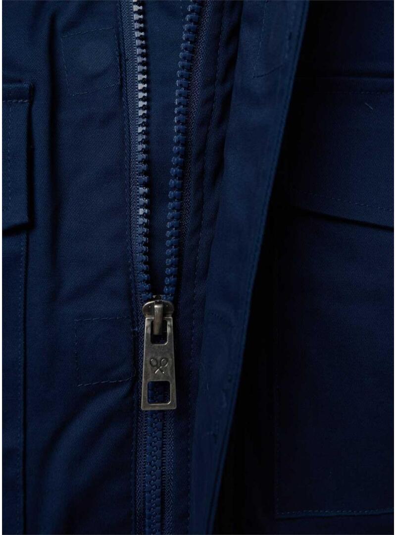 Cappotto Silbon. Stile parka. Colore blu. Taglio dritto. Tasche anteriori a toppa con patta. Colletto classico con cappuccio. Chiusura frontale con zip metallica. Con racchette ricamate a contrasto in blu sul torso.
