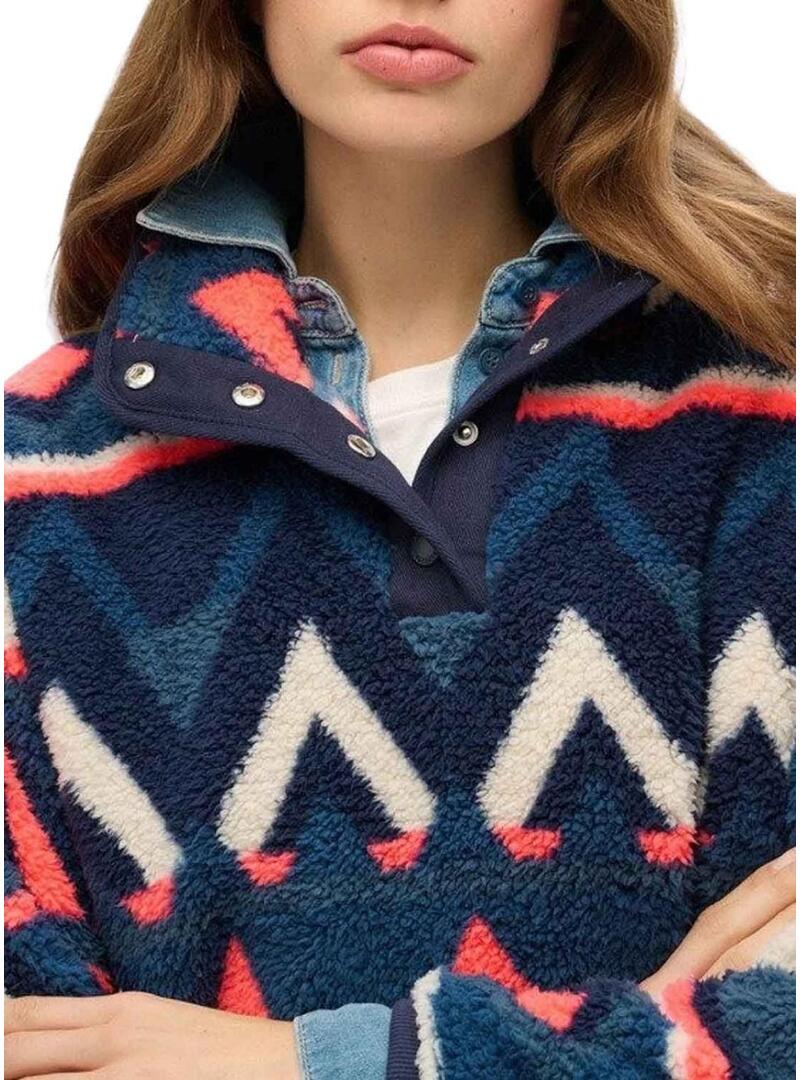 Polar Superdry. Modello Printed Henley. Motivo etnico multicolore. Predomina il colore blu scuro. Collo alto con quattro bottoni a pressione. Fondo con coulisse elastica. Logo di Superdry ricamato sulla manica. Tessuto super morbido. Spalle leggermente cadenti. Polsini a costine con elastico. Taglio oversize.