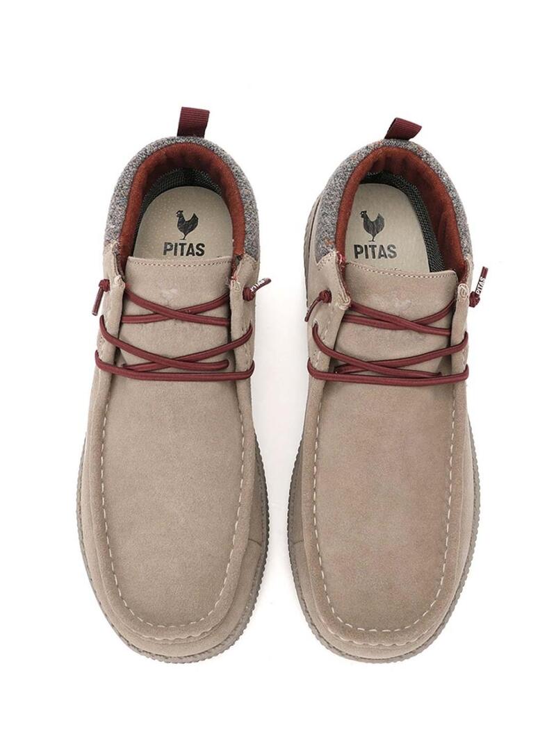 Stivali Walkin Pitas. Modello Wallabi BOB. Colore beige. Taglio in camoscio idrorepellente all'acqua con colletto in tessuto mélange. Lacci elastici a contrasto. Rivestimento in tessuto con membrana PITAS-TEX che garantisce comfort e protezione. Soletta estraibile in EVA PITAS-COMFORT con sottopiede in pelle. Suola EVA ultraleggera che offre leggerezza e flessibilità. Include lacci elastici aggiuntivi dello stesso colore del modello.
