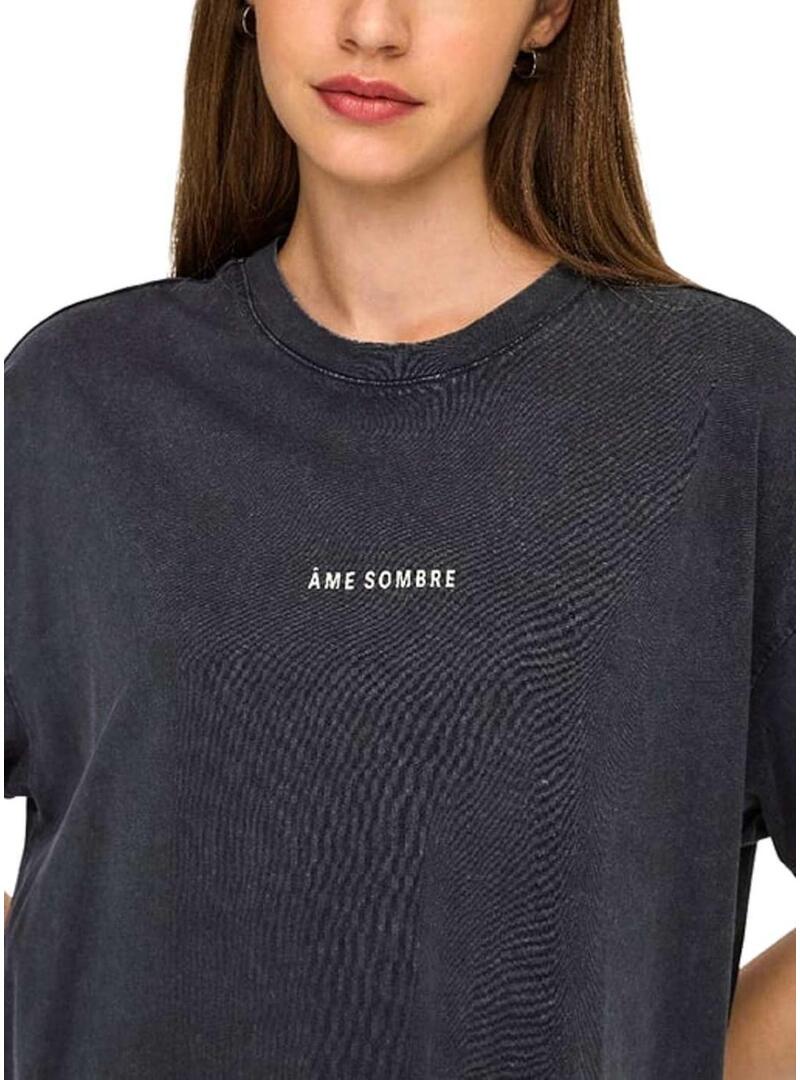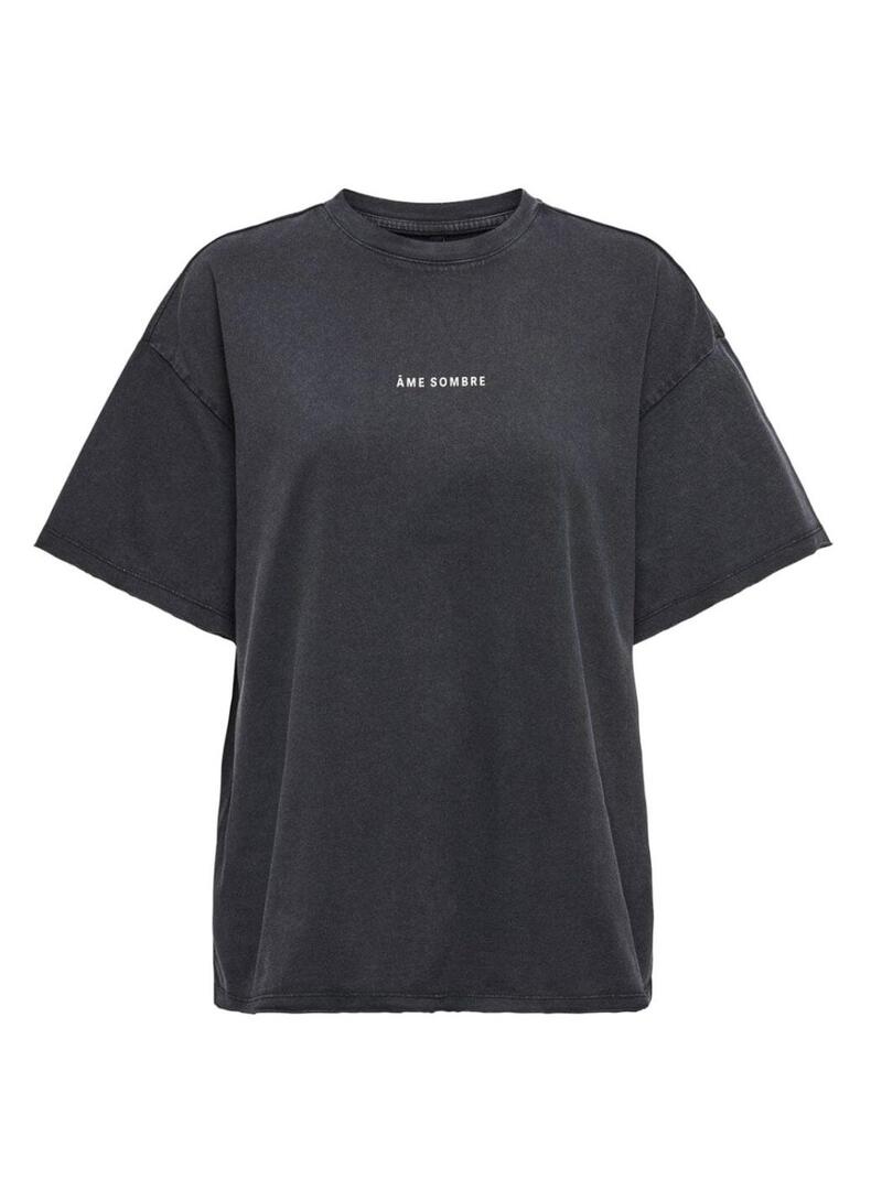 Maglietta Only. Modello Kinna. Colore nero. Collo rotondo. Manica corta. Stampa sul petto e sulla schiena. Taglio ampio. Spalle leggermente cadenti. Realizzato in tessuto organico.