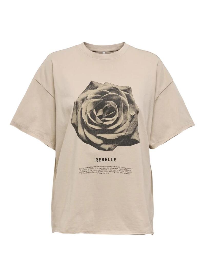 Maglietta Only. Modello Kinna. Colore beige. Collo rotondo. Manica corta. Stampa sul petto. Taglio ampio. Spalle leggermente cadenti.