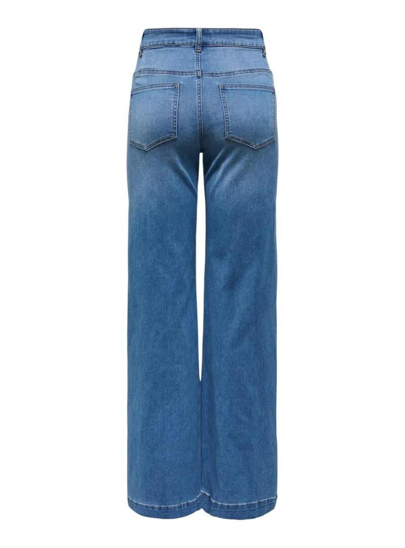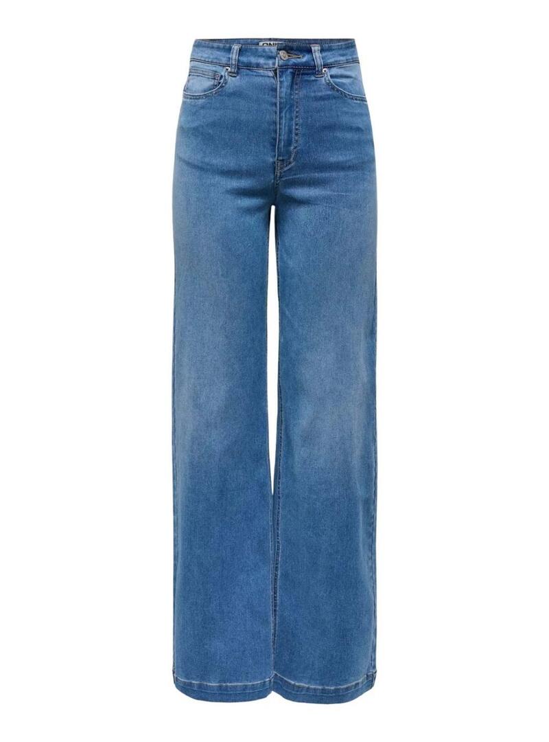 Pantaloni in denim Only. Modello Madison Royal. Colore blu. Denim medio. Vita alta. Cinque tasche. Passanti in vita per cintura. Gamba larga. Ampio dai fianchi alle caviglie. Tessuto massimo comfort.