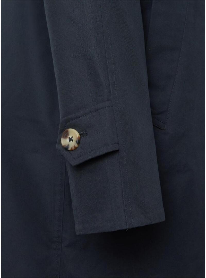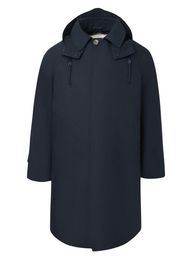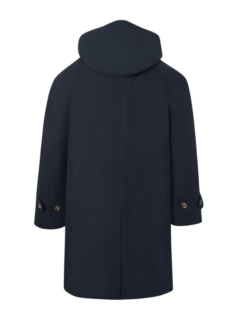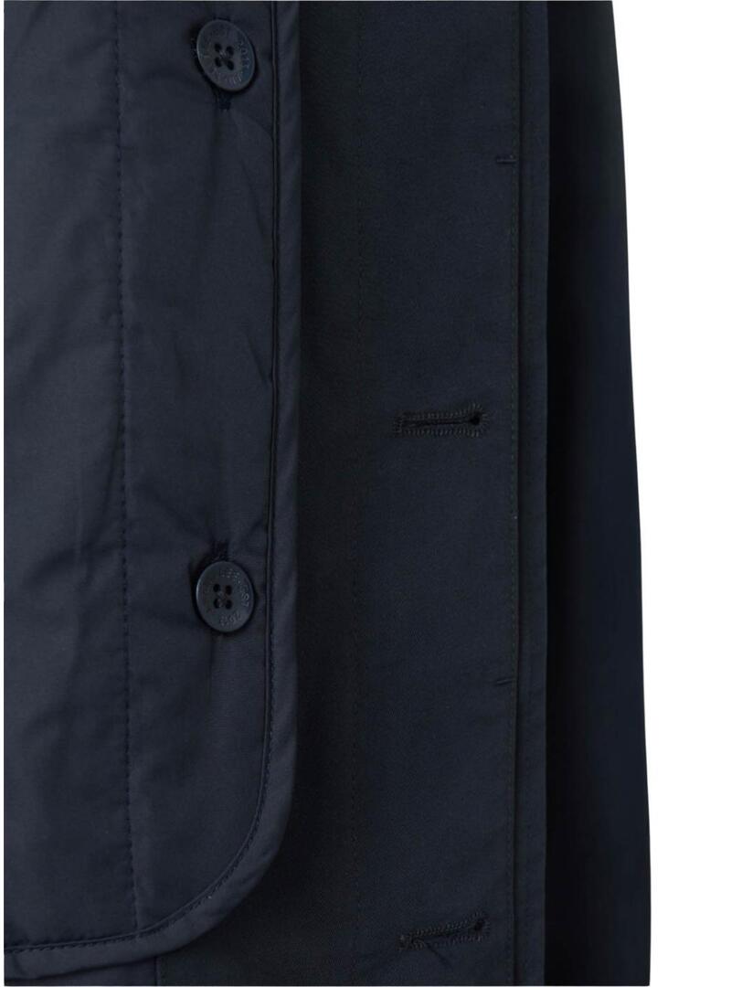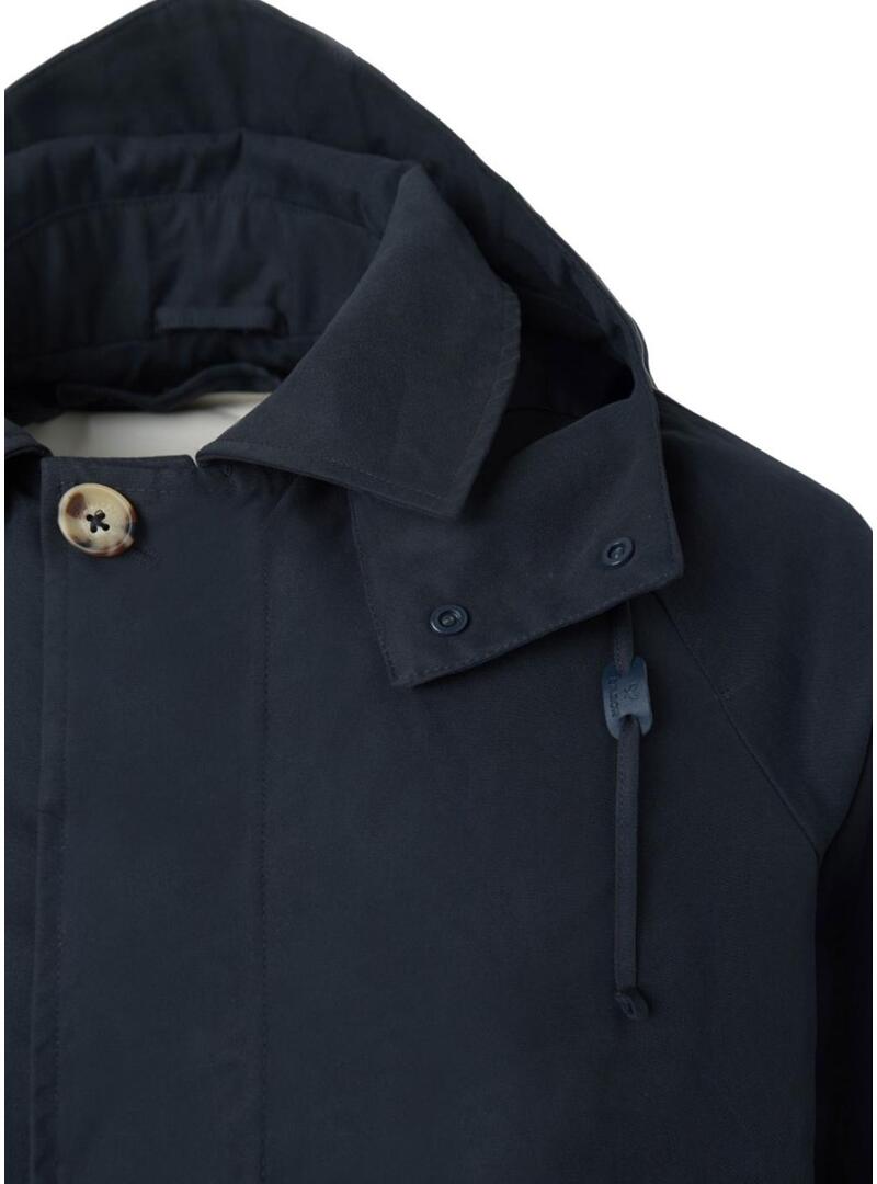 Trench Silbon. Colore blu scuro. Taglio dritto realizzato in una morbida miscela di cotone che garantisce comfort e durata. Colletto classico. Chiusura frontale con patta di bottoni personalizzati nascosti e un bottone a vista per un tocco distintivo. Maniche lunghe con regolatori ai polsini. Cappuccio con cordino regolabile per una maggiore protezione e stile. Fodera interna removibile per adattarsi a diverse condizioni climatiche.