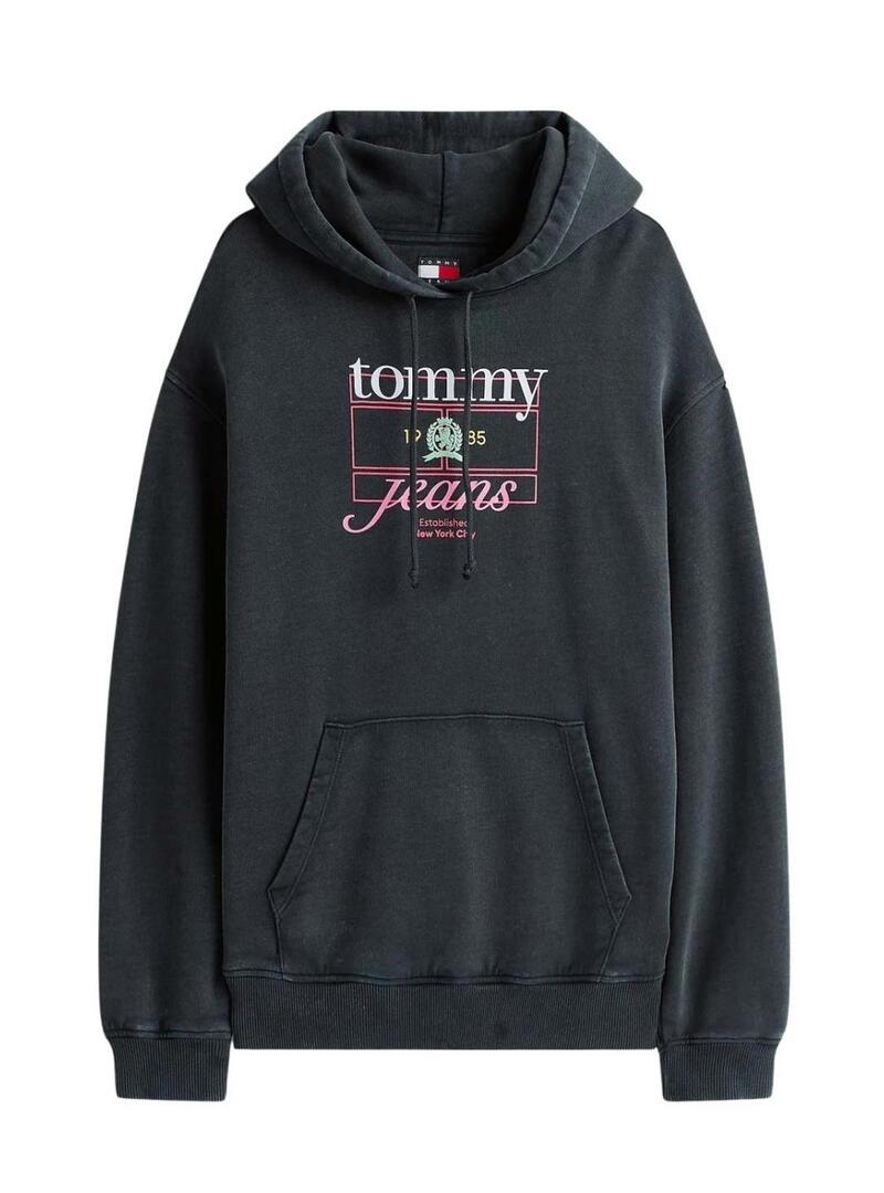 Felpa Tommy Jeans. Modello Crest Flag. Colore nero. Effetto lavato. Cappuccio regolabile con coulisse. Tasca frontale a marsupio. Logo sul petto. Vestibilità leggermente oversize. Orli a costine.