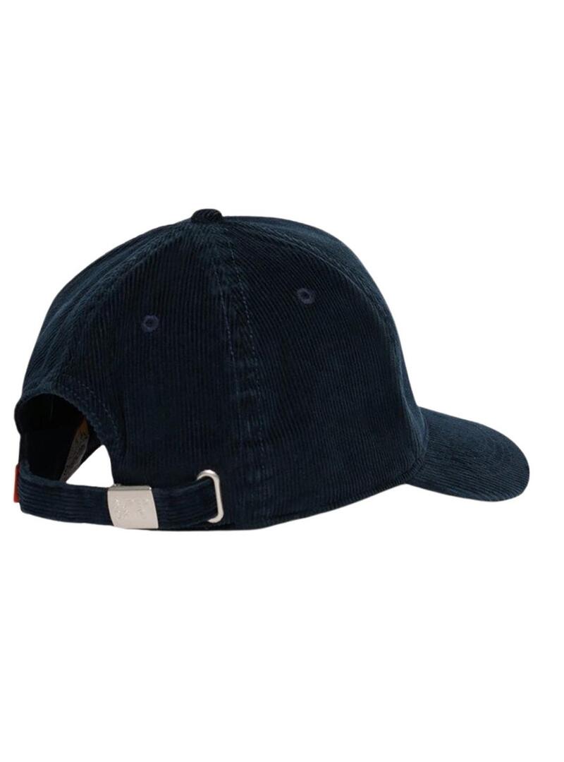 Cappello in velluto a coste Superdry. Modello Graphic Cord Trucker. Colore blu scuro. Design classico a sei pannelli. Finitura vintage. Visiera curva con effetto consumato. Parte posteriore con cinturino regolabile. Stemmi ricamati.