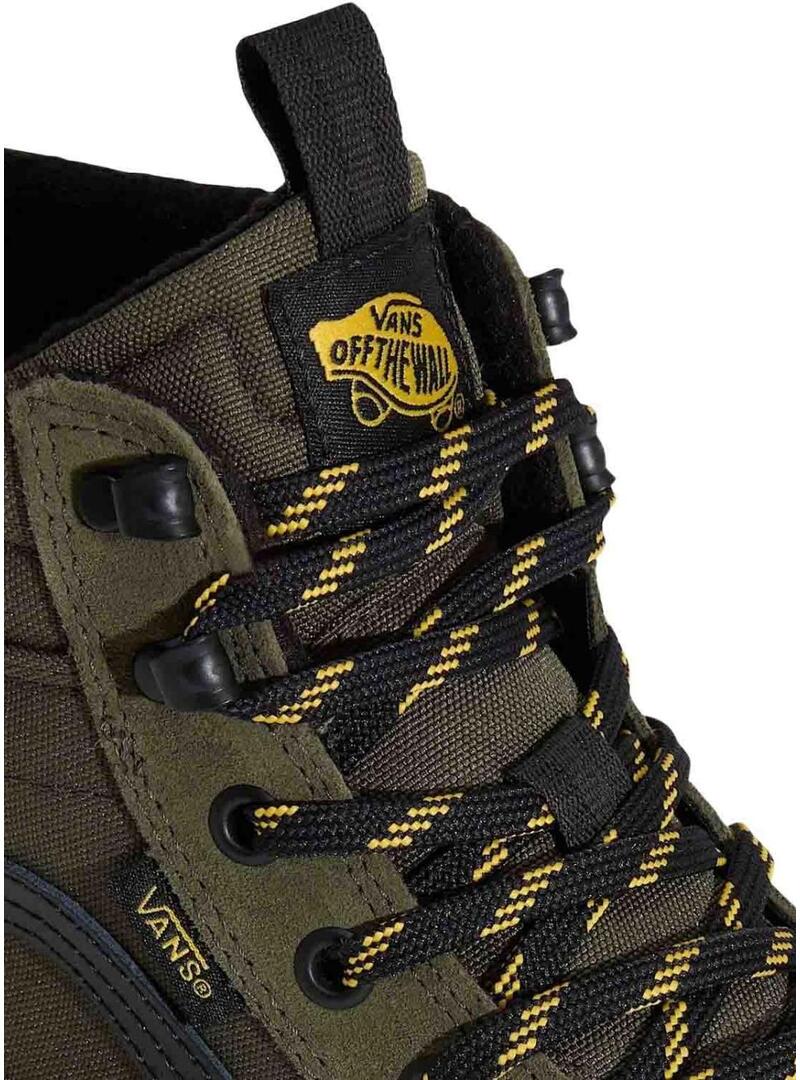 Scarpe Vans. Modello Sk8-Hi. Colore verde. Design Mountain Edition MTE, ideale per la stagione fredda. Membrana HydroGuard che offre controllo dell'umidità, termoregolazione e protezione impermeabile. Isolamento termico Primaloft per mantenere il calore. Parte superiore parzialmente in camoscio. Suola All-Trac antiscivolo per una migliore trazione sulla neve e superfici bagnate. Punta arrotondata e tacco piatto. Chiusura con lacci e occhielli di stile trekking. Funzioni impermeabile e traspirante. Dettagli con tirante sulla linguetta e sul tallone. Soletta imbottita e rimovibile. Suola esterna aderente e antiscivolo.