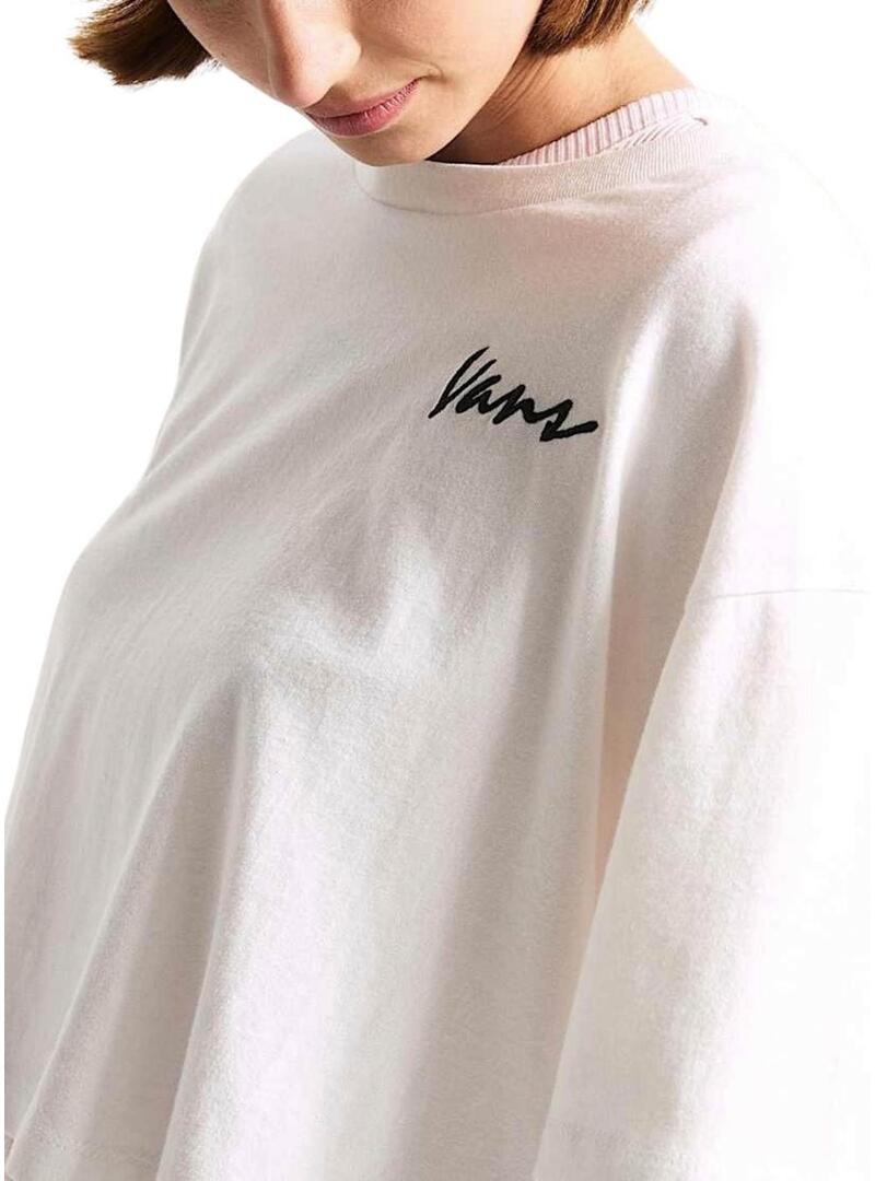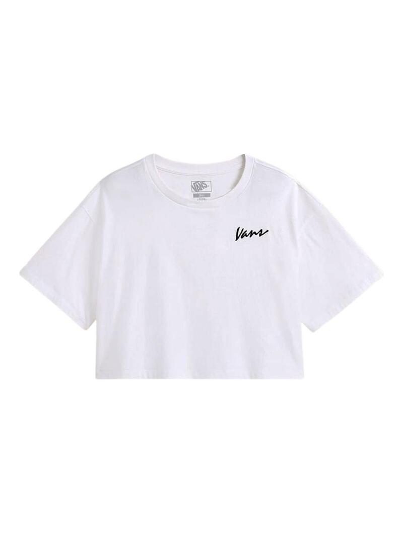 Maglietta Vans. Modello Classic Script. Colore bianco. Colletto rotondo. Manica corta. Vestibilità ampia. Taglio corto. Marchio stampato sul petto in nero.