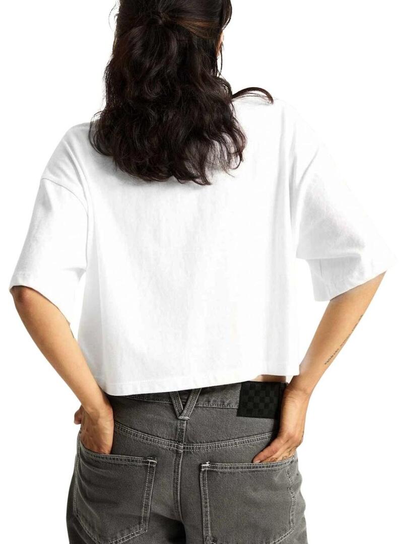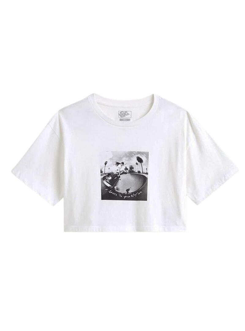 Maglietta Vans. Modello Rhythm. Colore bianco. Girocollo. Manica corta. Vestibilità oversize. Fotografia Skate stampata sul davanti in bianco e nero. Taglio cropped.
