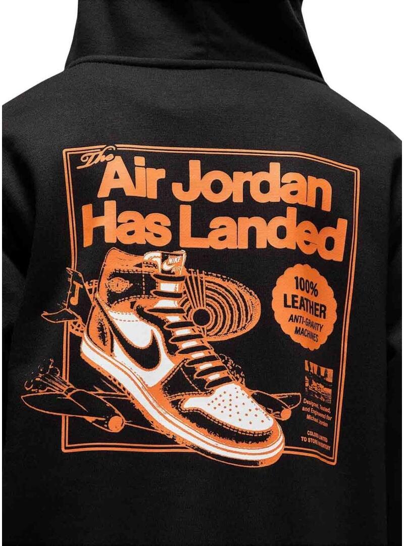 Felpa Jordan. Modello Air Has Landed. Colore nero. Con cappuccio. Orli a costine. Tasca marsupio nella parte anteriore. Grafica retrò stampata sul petto e sulla schiena. Spalle leggermente cadenti. Taglio ampio.