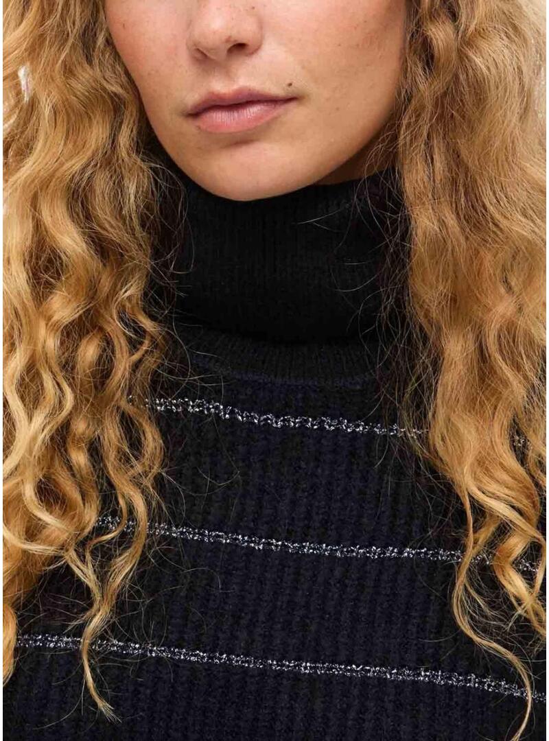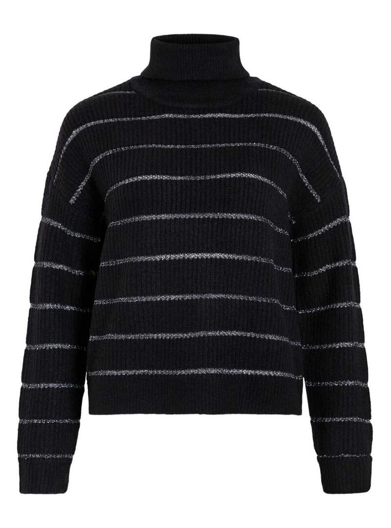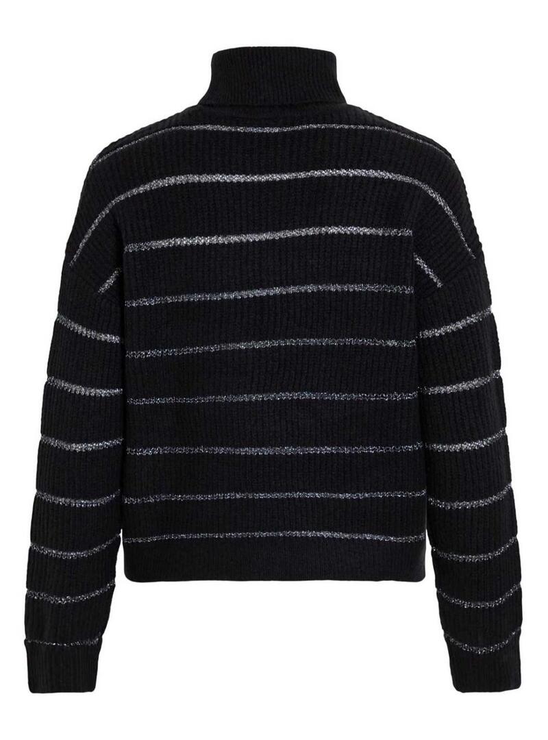 Maglia Vila. Modello Vizaza. Colore nero. Collo alto. Vestibilità oversize. Tessuto a coste. Righe orizzontali in contrasto con fili metallizzati.