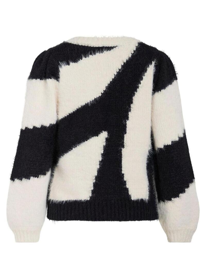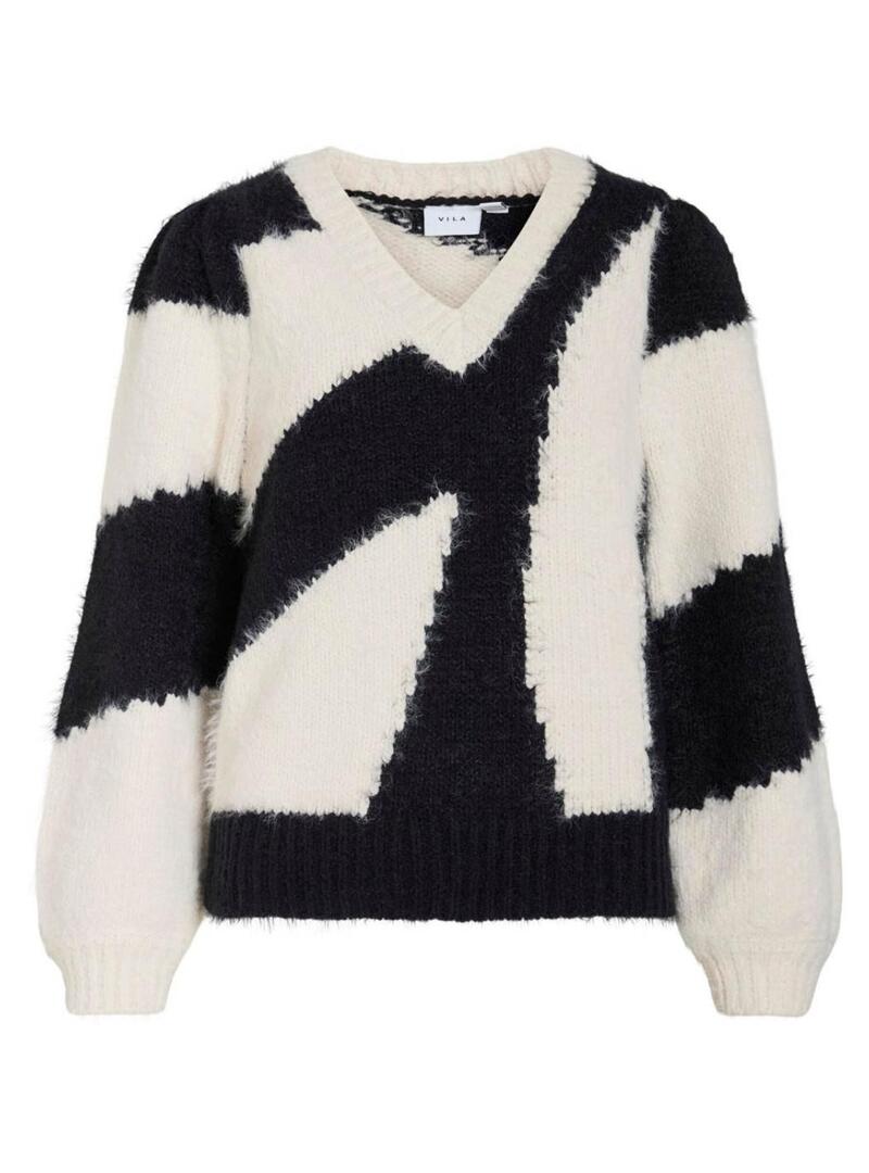 Maglia Vila. Modello Nuo. Colore nero e bianco. Scollo a V. Tessuto peloso morbido. Orli a costine. Vestibilità ampia. Stampa astratta.