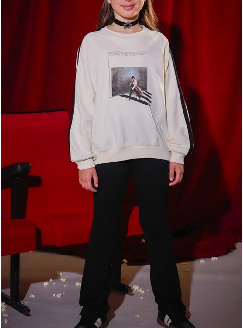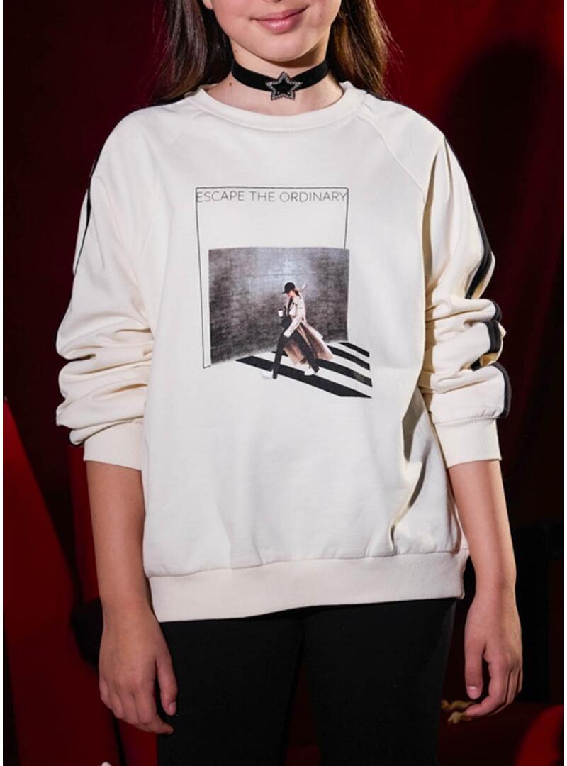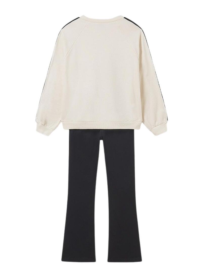 Set Mayoral. Tuta modello. Felpa beige. Collo rotondo. Estremità elastiche. Immagine stampata sul petto con il messaggio Escape The Ordinary. Leggings neri con taglio flare. Vita elastica.