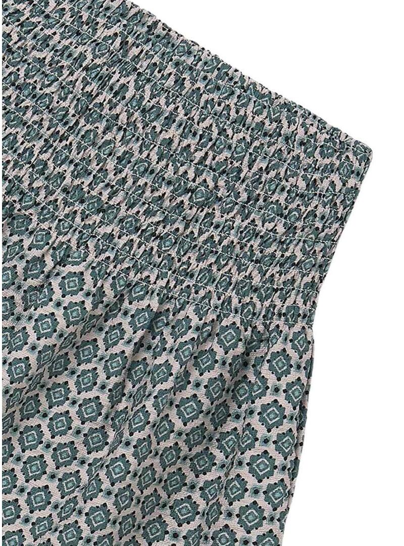 Gonna Mayoral. Modello con stampa geometrica. Colore blu. Taglio mini. Taglio voluminoso. Vita con elastico a nido d'ape.