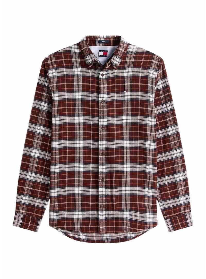 Camicia Tommy Jeans. Modello Flanella. Colore marrone. Stampato geometrico. Colletto a bottoni. Logo ricamato sul petto. Taglio regolare. Fondo arrotondato. Tessuto in flanella morbida e calda.