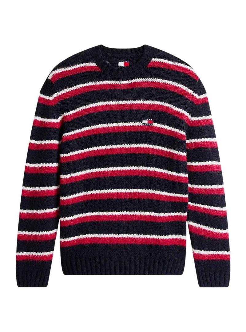 Maglia Tommy Jeans. Modello Stripe. Colore rosso e blu scuro. Collo rotondo. Manica lunga. Orli a costine. Vestibilità regolare. Applicazione del marchio ricamato sul petto. Tessuto morbido. Stampato a righe in contrasto.