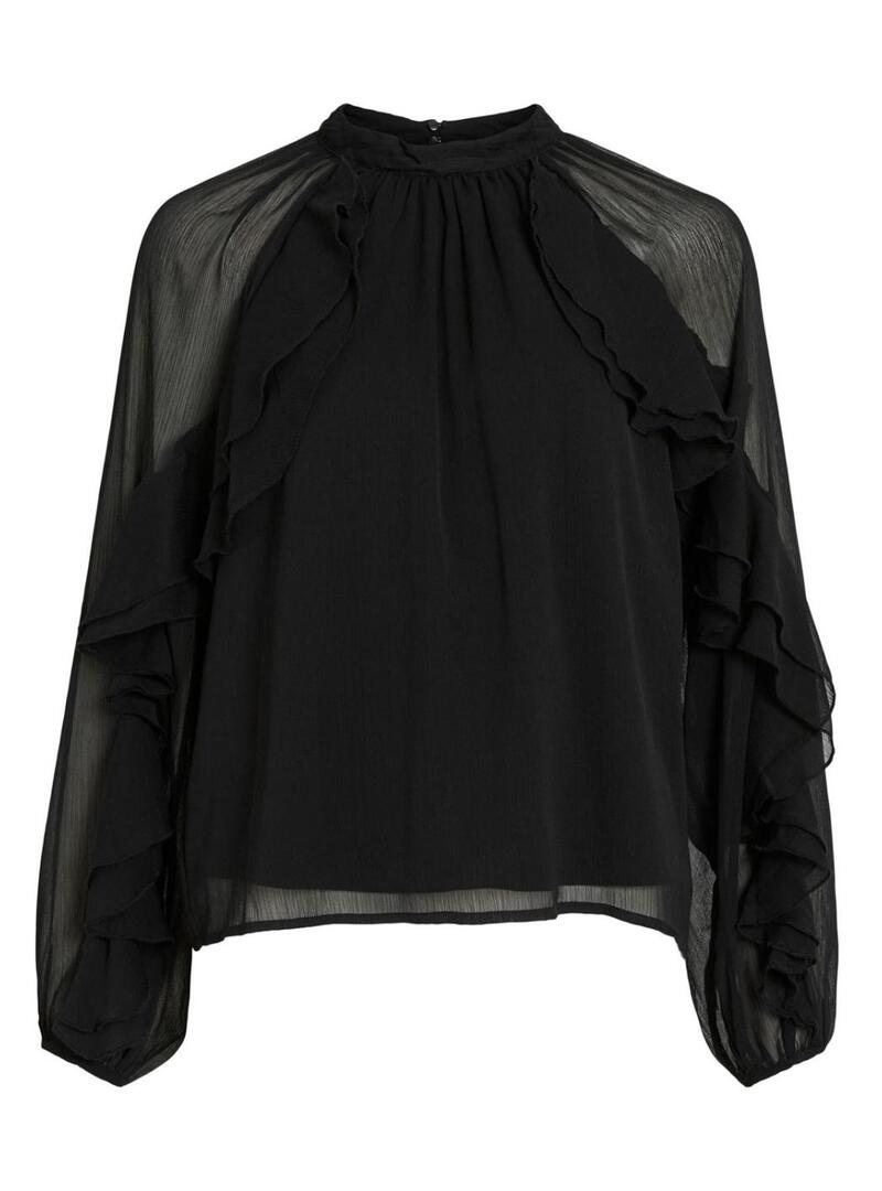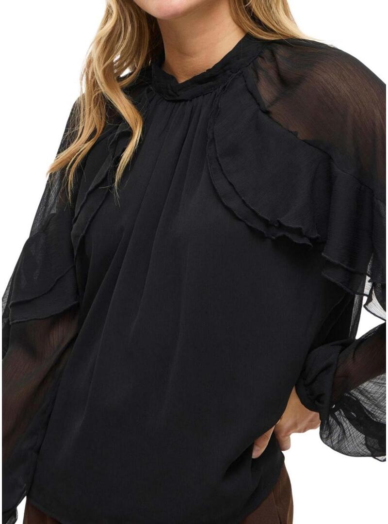 Camicetta Vila. Modello Vibinna. Colore nero. Collo alto con chiusura a bottoni sul retro. Tessuto leggero in chiffon trasparente. Corpo foderato. Silhouette vaporosa. Volant sulle maniche.