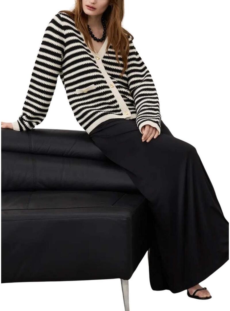 Giacca Vila. Modello Rita. Colore nero e bianco. Tessuto a righe orizzontali. Scollo a V. Chiusura con bottoni dorati. Tasche laterali finte. Orli a coste.