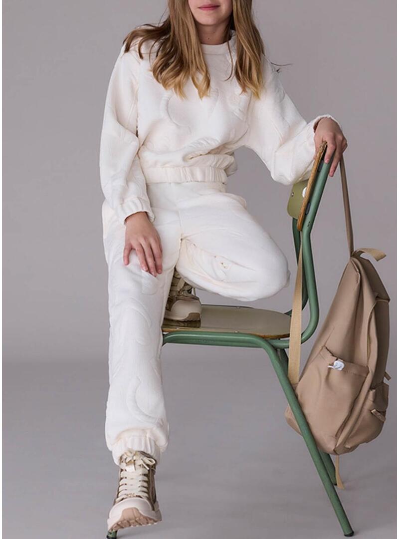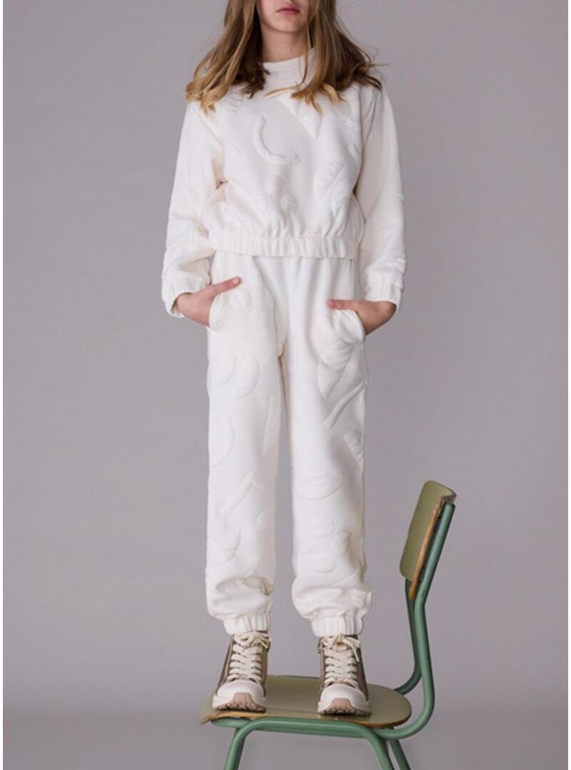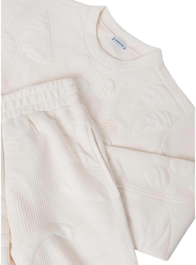Tuta Mayoral. Modello trapuntato. Colore beige. Colletto rotondo. Estremità elastiche. Vestibilità ampia. Tessuto a coste e con motivo geometrico in rilievo.
