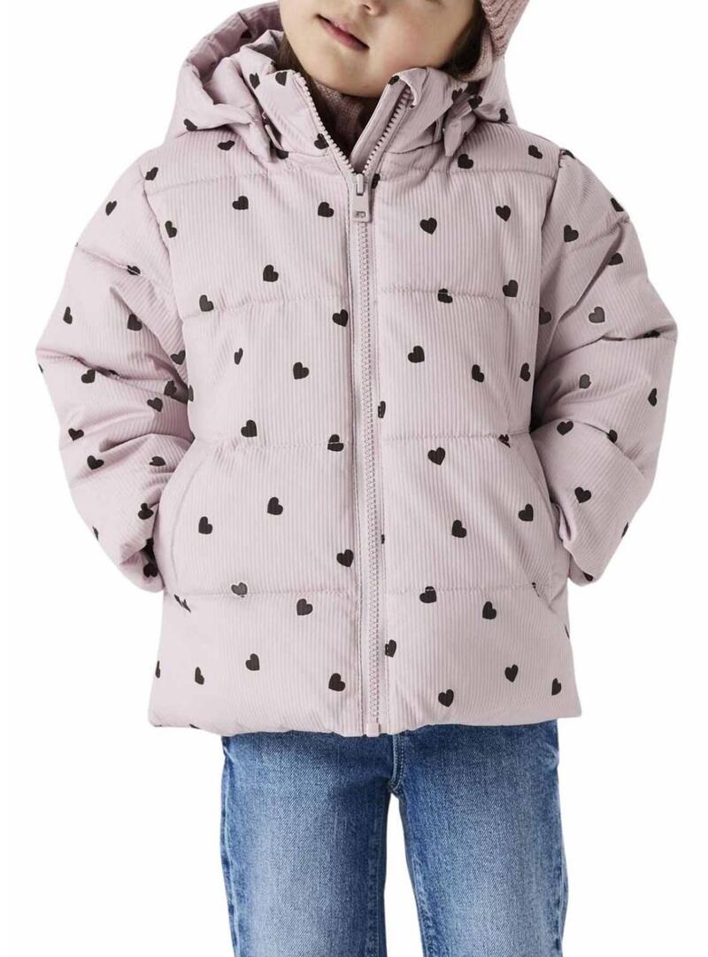 Giacca Name It. Modello Monday. Colore rosa. Tessuto a righe micro trapuntato. Colletto alto. Chiusura con zip. Cappuccio removibile. Stampato con cuori. Tasche laterali. Banda riflettente sulla schiena.