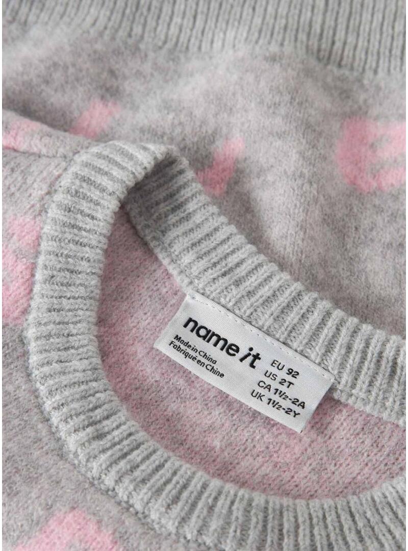 Maglione Name It. Modello Foline. Colore grigio e rosa. Collo rotondo. Orli a costine. Spalle cadenti. Vestibilità ampia. Tessuto con stampa di lettere in intarsio.
