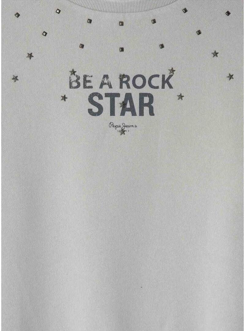 Felpa Pepe Jeans. Modello Addy. Colore grigio. Collo rotondo. Orli a costine. Vestibilità regolare. Fit rilassato. Collo rotondo. Manica lunga. Effetto lavato. Spalle leggermente cadenti. Stampa BE A ROCK STAR con effetto consumato sul petto. Borchie metalliche decorative sul petto e sulle spalle. Orli a costine.