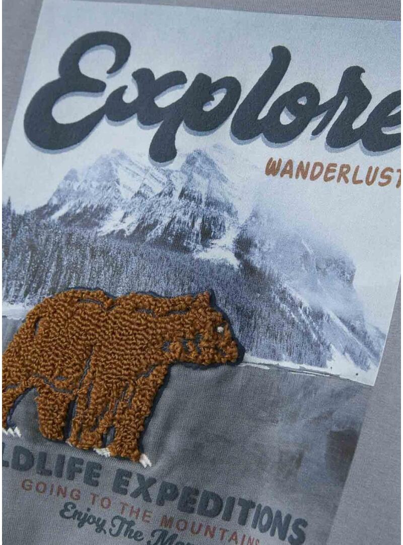 Felpa Name It. Modello Moran. Colore blu. Collo rotondo. Orli a costine. Vestibilità regolare. Illustrazione Explorer stampata sul davanti. Dettaglio orso in rilievo.