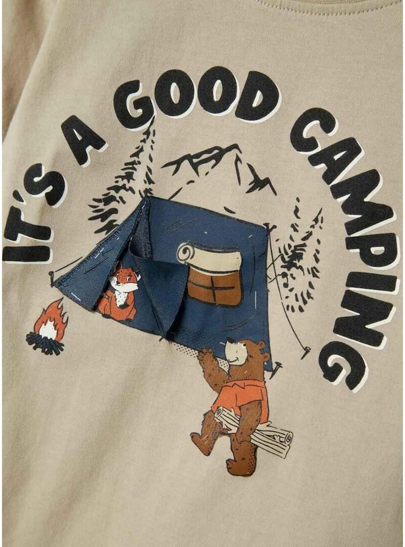 Maglietta Name It. Modello Molen. Colore beige. Collo rotondo. Manica lunga. Vestibilità regolare. Illustrazione campeggio stampata sul davanti.