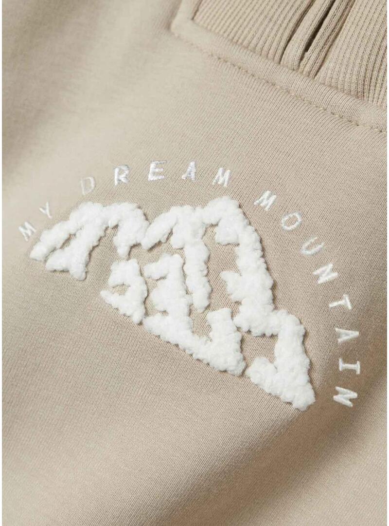 Felpa Name It. Modello Mobie. Colore beige. Estremità a costine. Vestibilità oversize. Collo alto con zip. Manica a raglan. Logo stampato in rilievo bianco sul davanti.