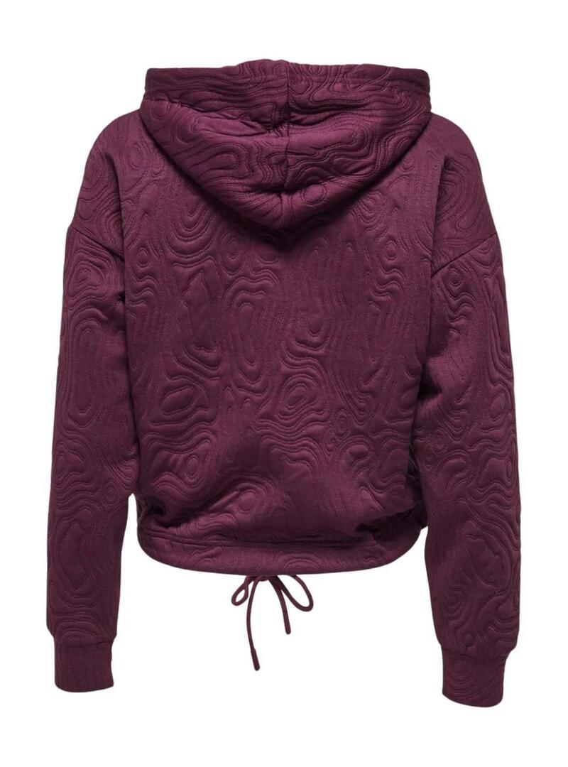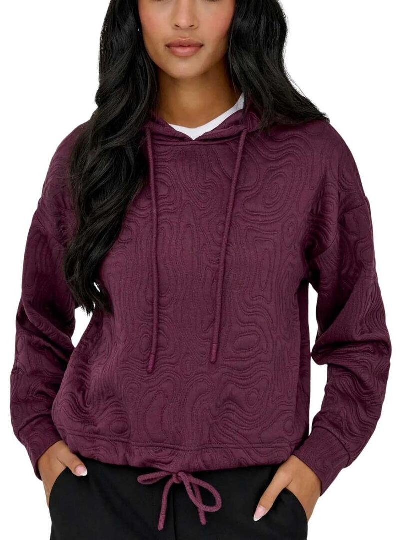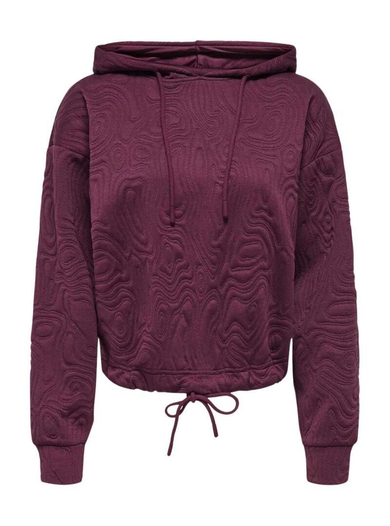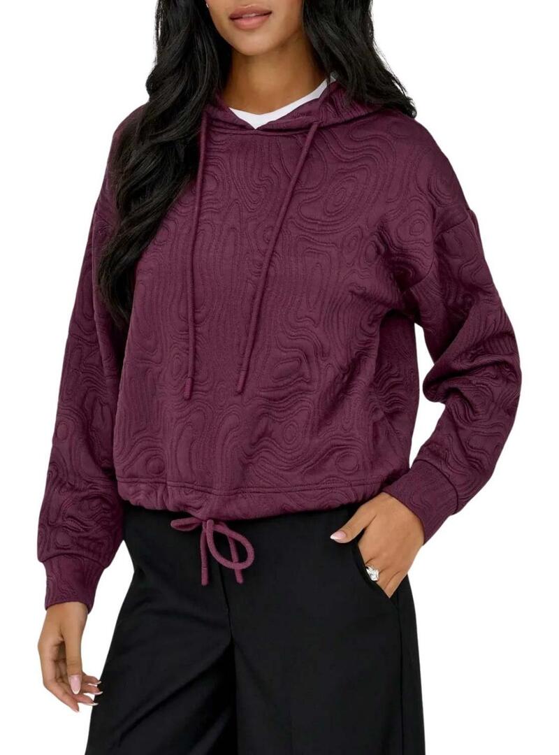 Felpa Only. Colore granata. Taglio corto. Maniche lunghe. Spalle cadenti. Con cappuccio. Vita regolabile con coulisse. Stampa tono su tono in rilievo.