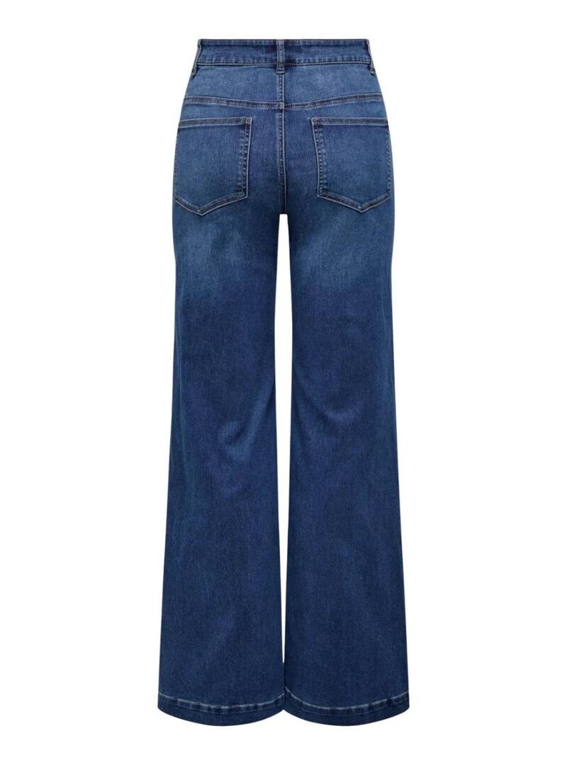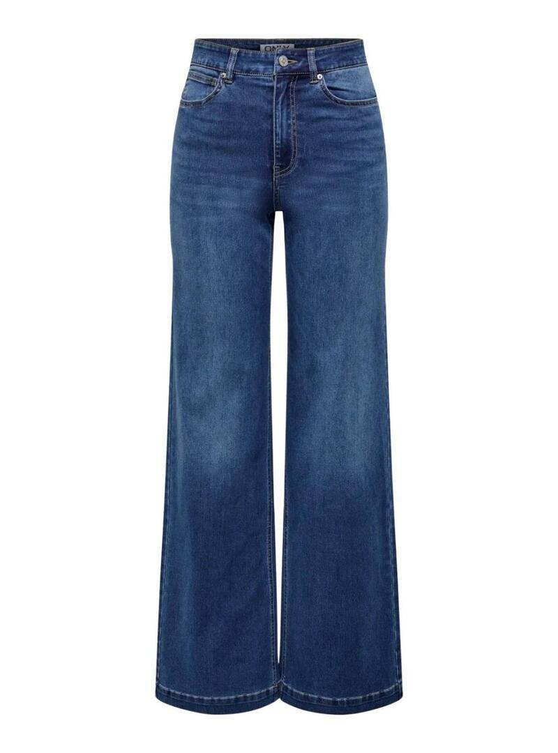 Pantaloni in denim Only. Modello Madison Royal. Lavaggio blu scuro. Tessuto morbido. Vita alta. Cinque tasche. Taglio ampio. Largo dalle anche alle caviglie. Gamba larga. La modella indossa la taglia S.