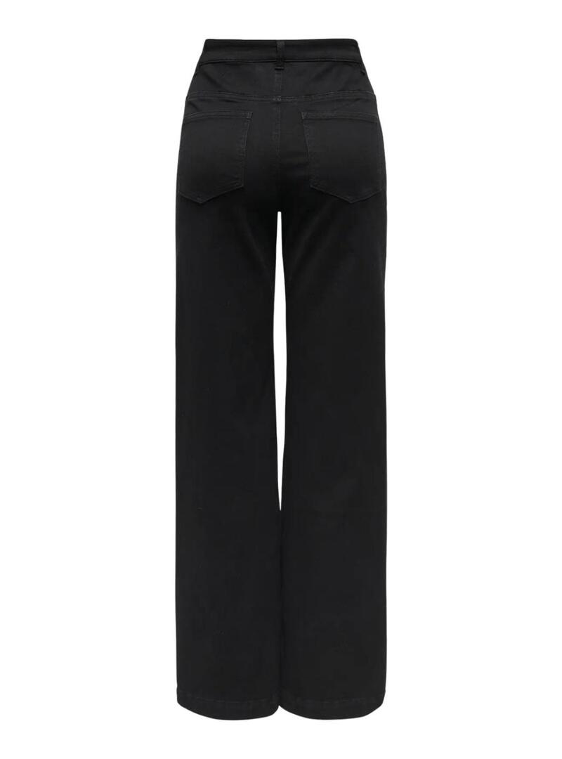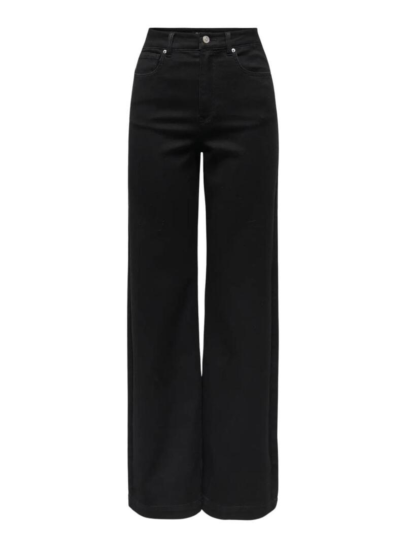 Pantaloni in denim Only. Modello Madison Royal. Colore nero. Vita alta. Cinque tasche. Passanti in vita per la cintura. Gamba larga. Largo dalle anche alle caviglie. Tessuto comodo. La modella indossa la taglia S.