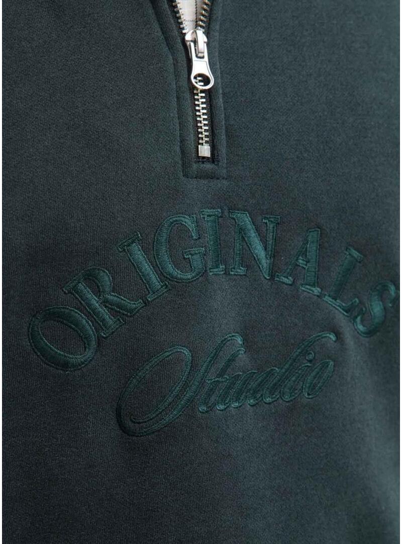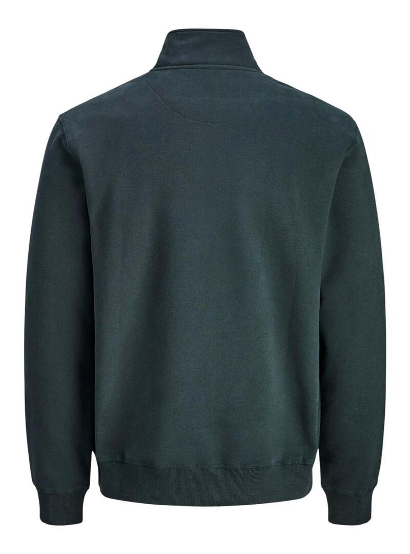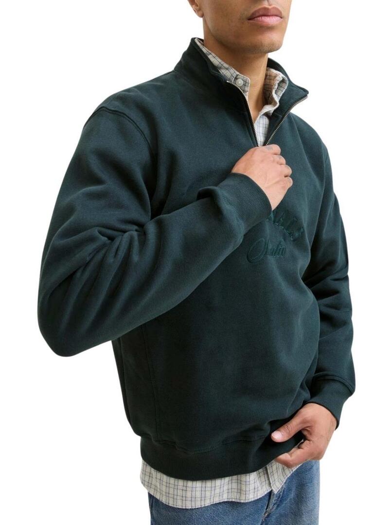 Felpa Jack and Jones. Modello Bleecker. Colore verde. Colletto alto con zip. Etichetta laterale. Logo ricamato in tinta sul davanti. Orli a costine. Vestibilità regolare.