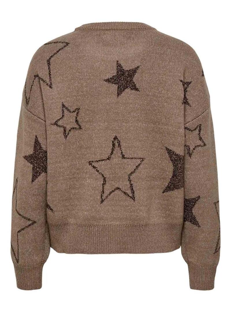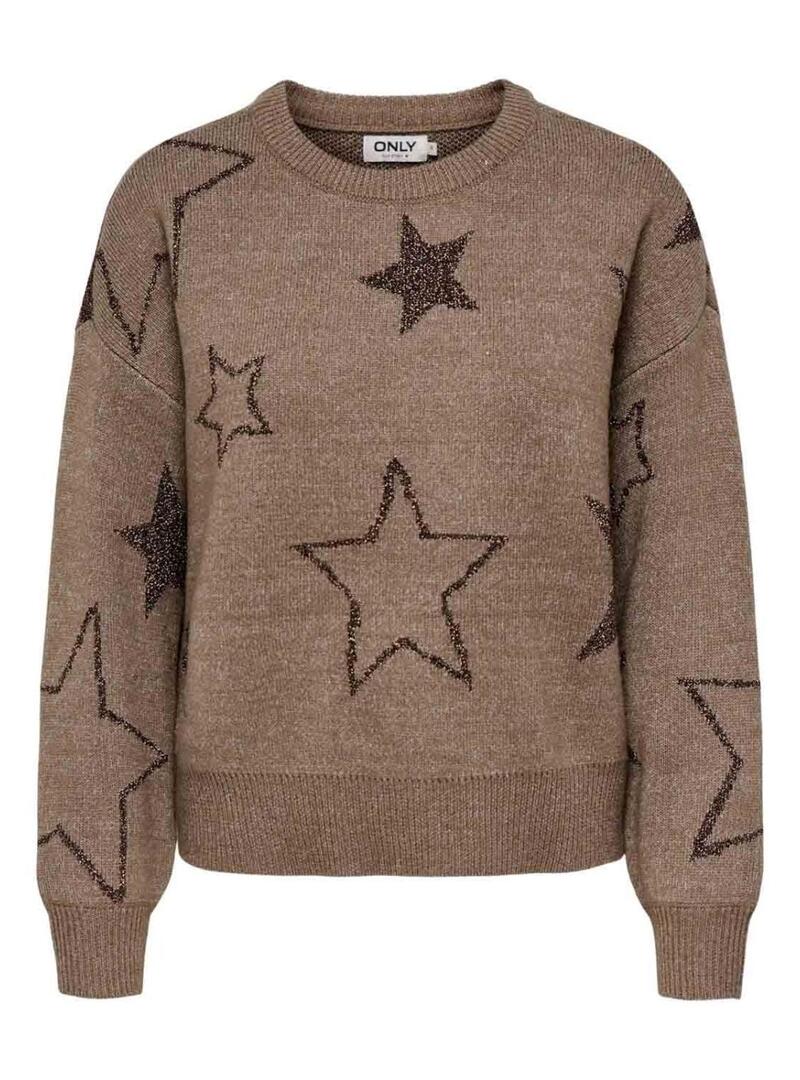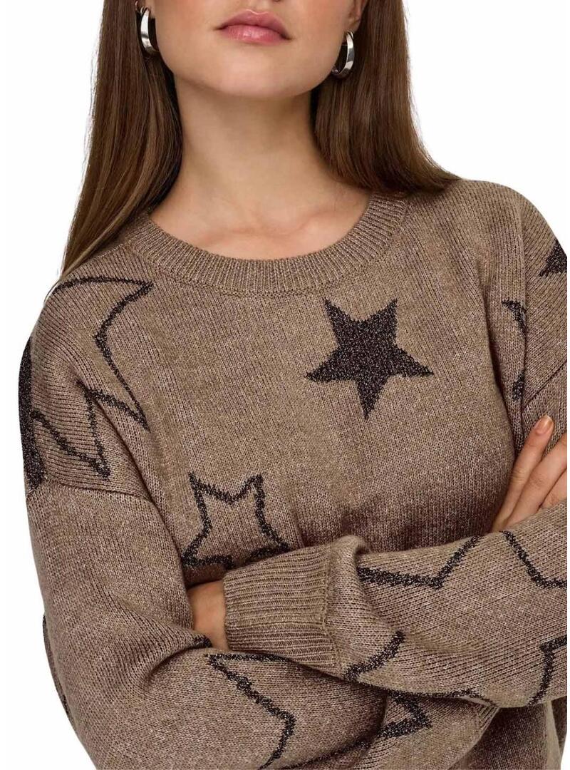 Maglia Only. Girocollo. Manica lunga. Colore tostato. Spalle cadenti. Bordi a costine. Stampe stellate con glitter. Formato regolare. Il modello indossa la taglia S.