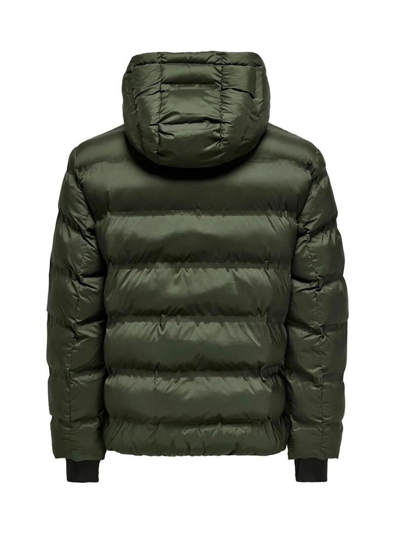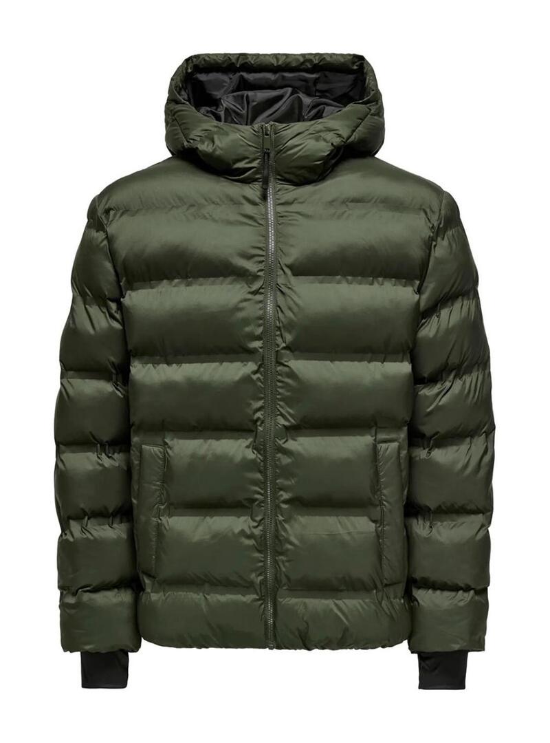 Giacca Only and Sons. Tessuto trapuntato. Con cappuccio. Colore verde. Manica lunga. Chiusura anteriore con zip. Tasche laterali. Collo alto. Taglio corto. Resistente all'acqua. Cuciture termosaldate. Realizzato con tessuto riciclato.