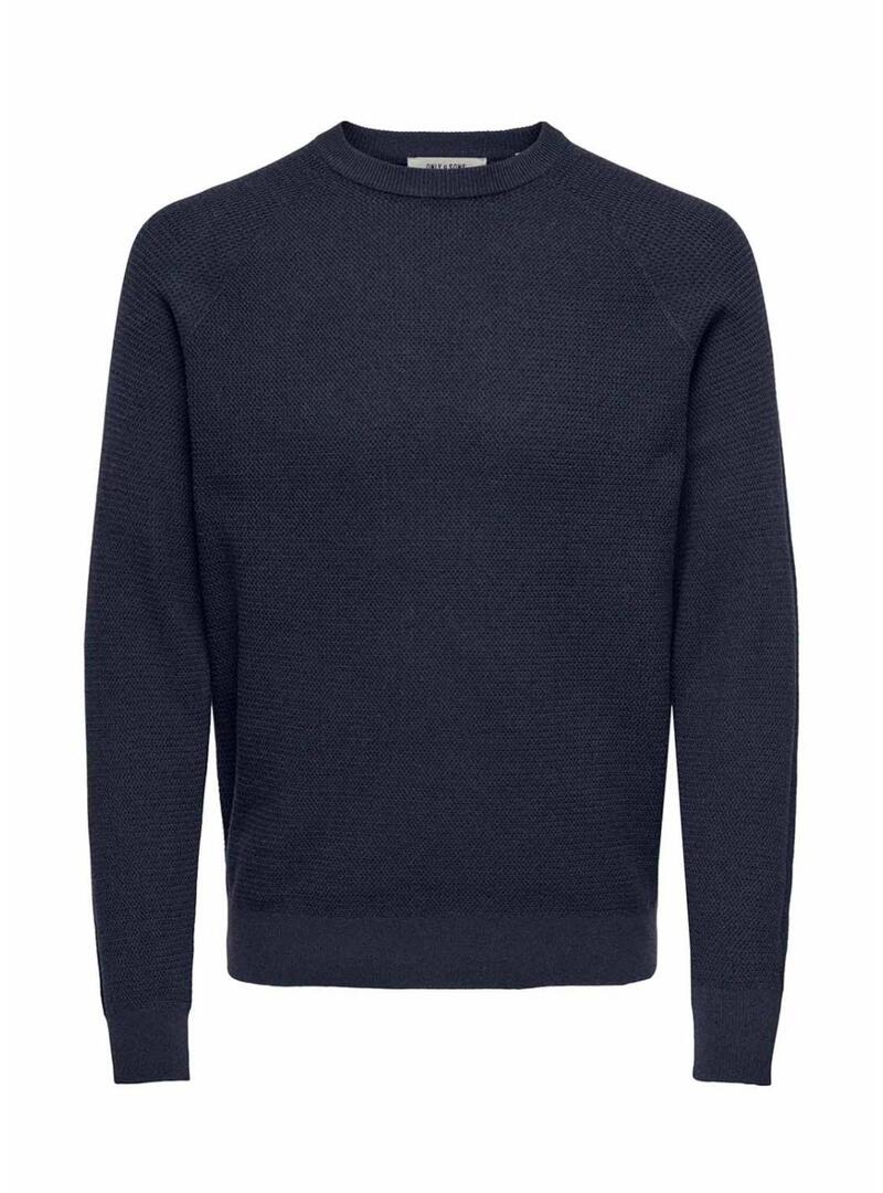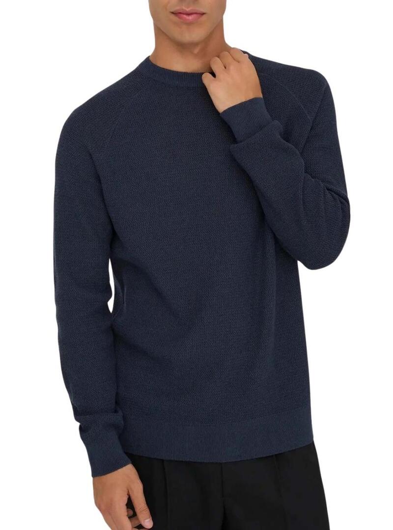 Maglia Only and Sons. Colore blu scuro. Tessuto a maglia strutturato. Collo rotondo. Manica lunga. Orli a costine. Taglio regolare. Tocco morbido. Maniche raglan.