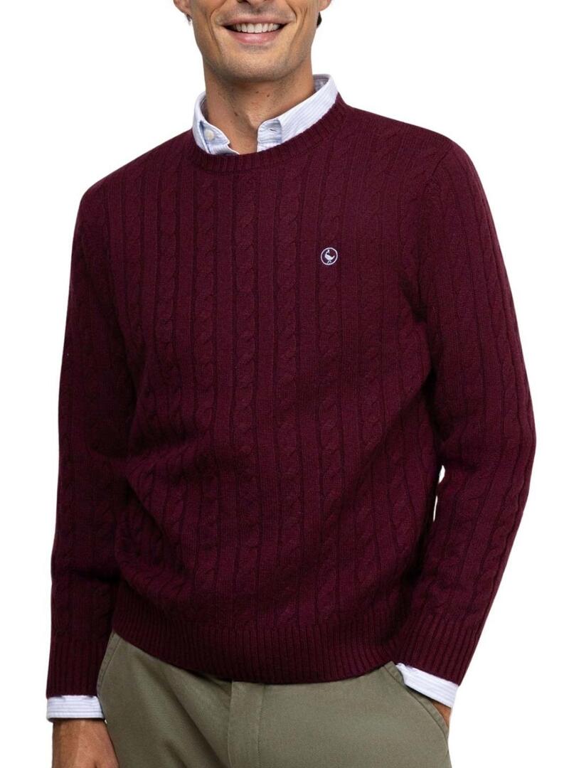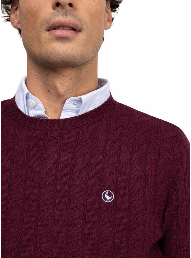 Maglia El Ganso. Colore granata. Tessuto in lana. Punto a treccia. Collo rotondo. Logo ricamato sul petto a contrasto. Finiture a coste. Il modello indossa la taglia M.