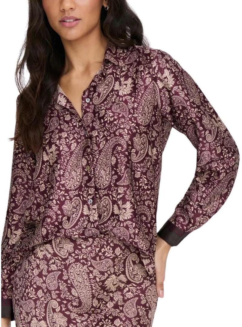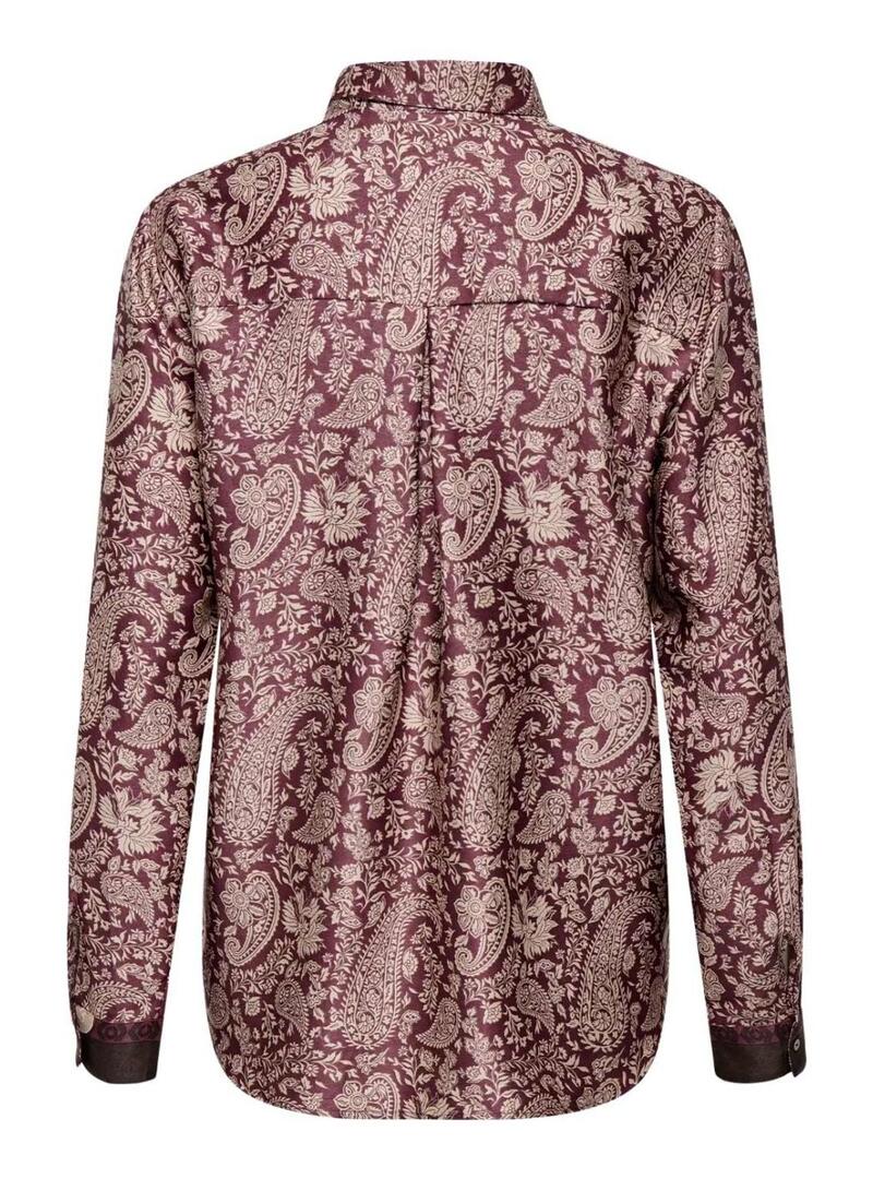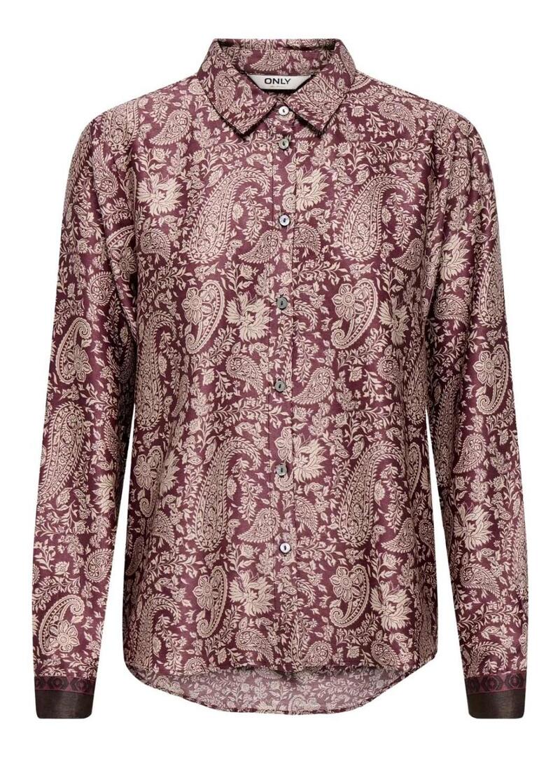 Camicia Only. Modello Jane. Colore bordeaux. Stampato Paisley. Chiusura anteriore con bottoni. Tessuto leggero e morbido. Taglio regolare. Manica lunga. Il modello indossa la taglia S.